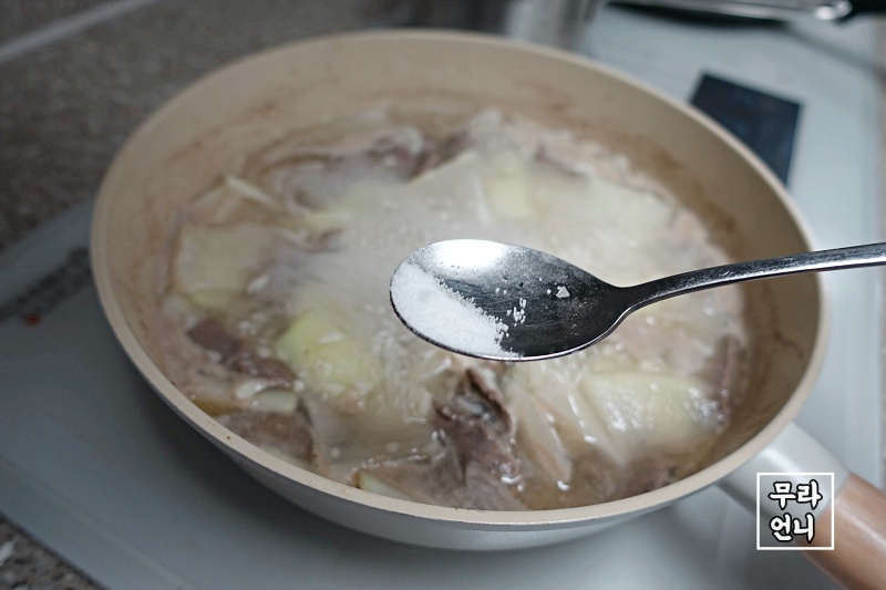 중약불에서 은근히 끓여 주시면 고기와 무에서 맛있는 맛이 나와요