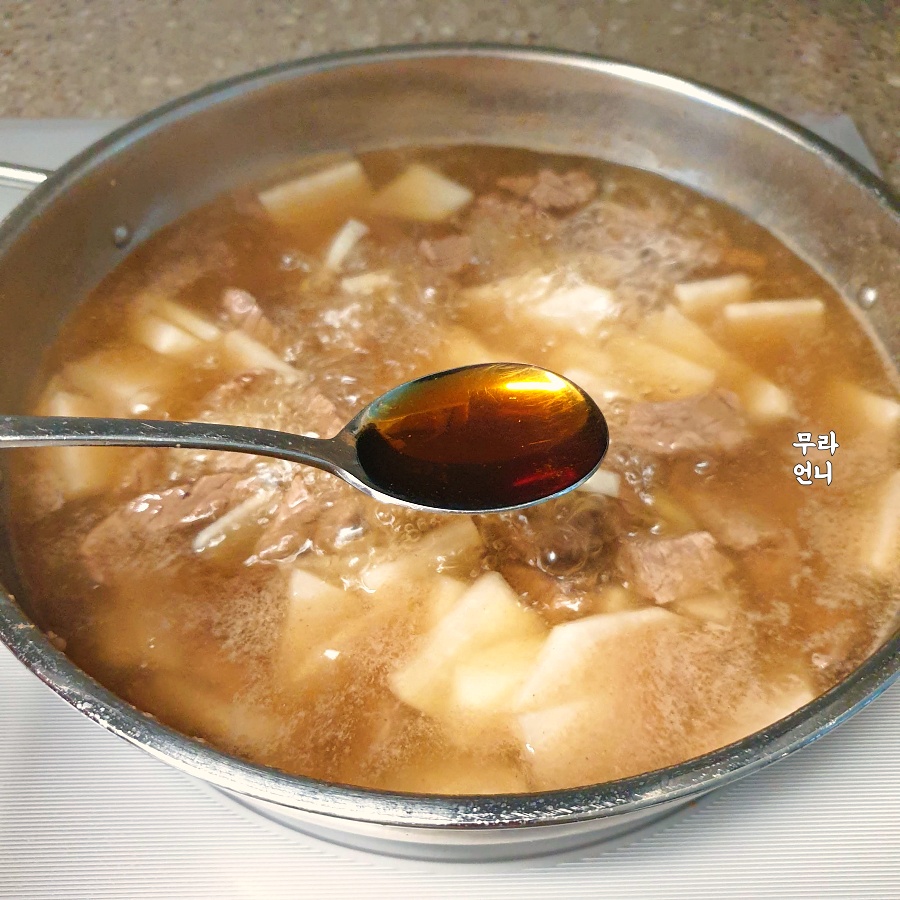 육수에 무를 넣을 때에는 국간장 1스푼 넣고 끓여주면