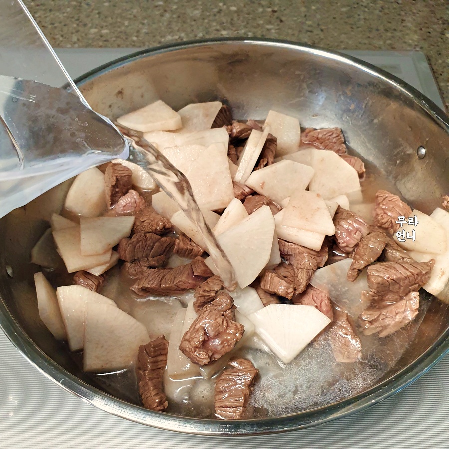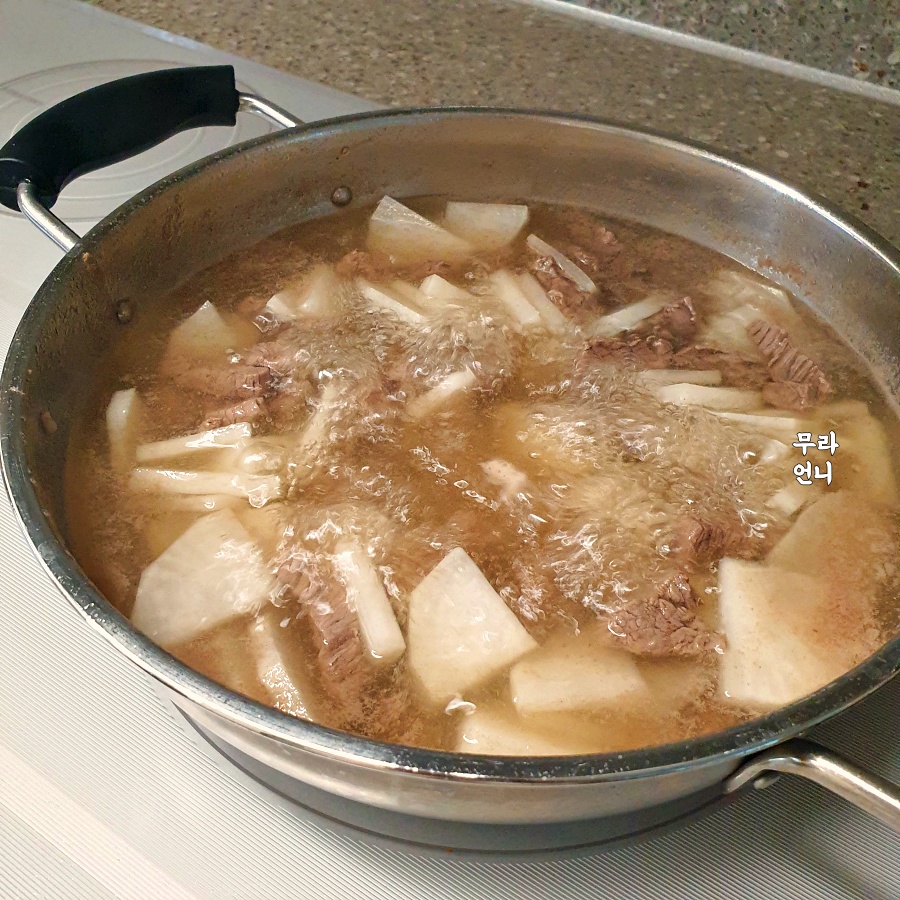 육수에 무를 먼저 넣고 끓이다가