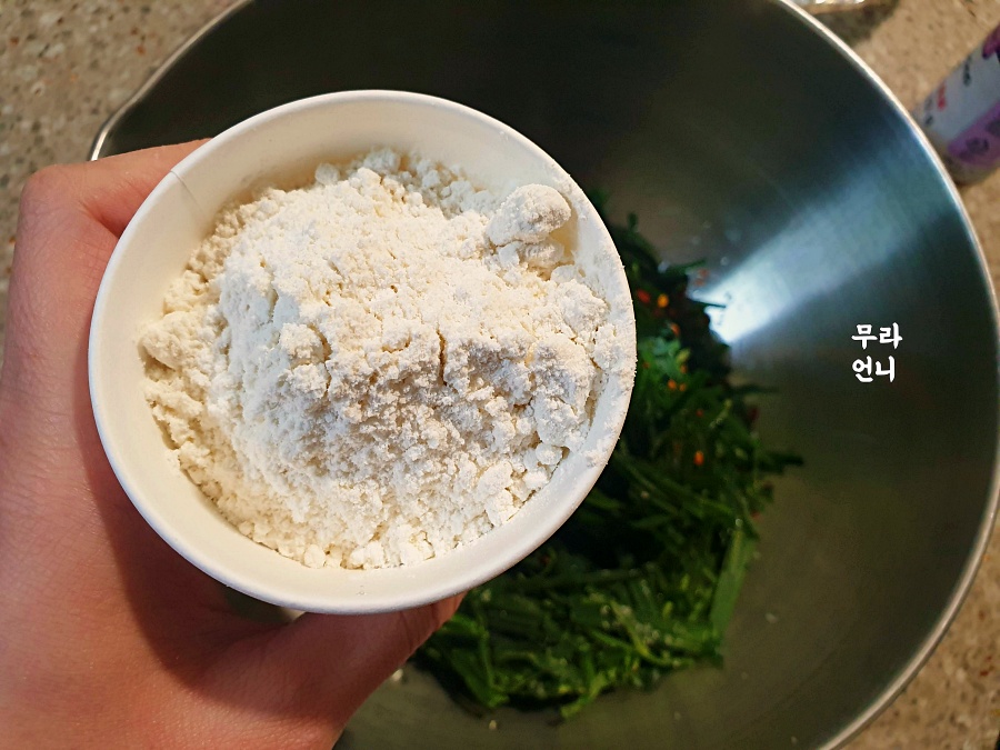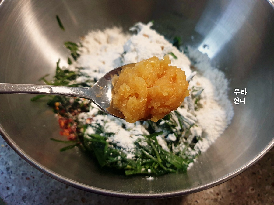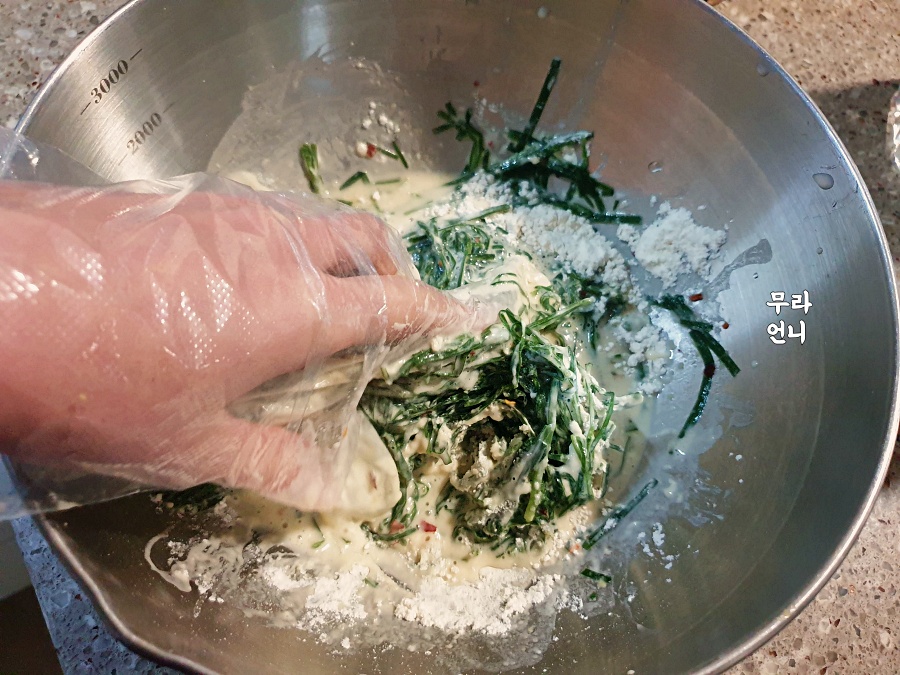 - 부추, 물1컵, 밀가루2컵, 페페로치노,