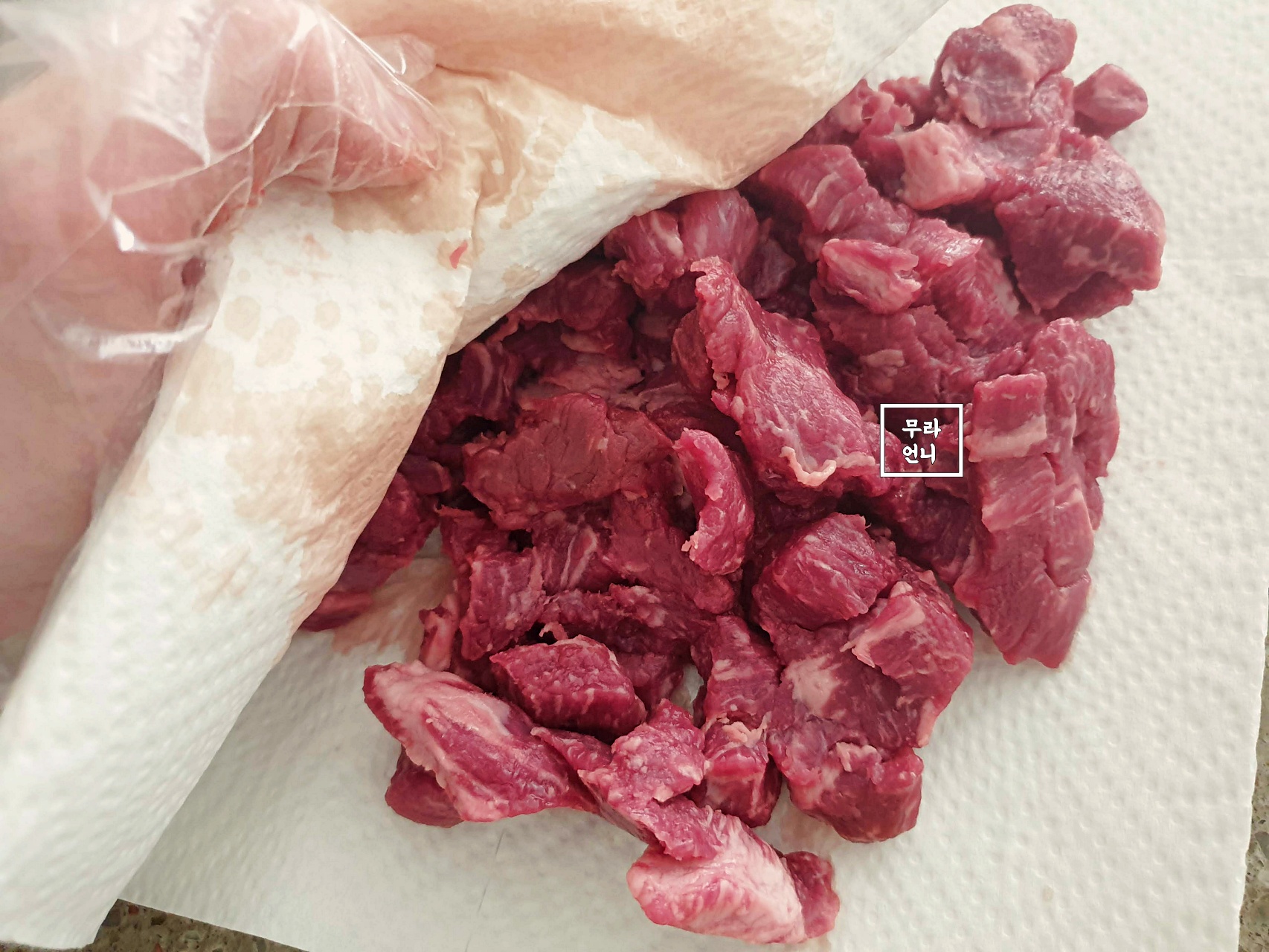 키친타올로 소고기의 핏물을 닦아 줍니다