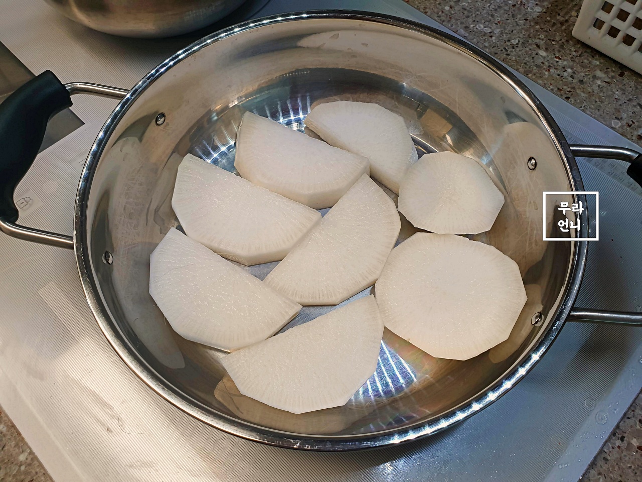 물이 거의 줄어들면 무가 들러붙지는 않는지