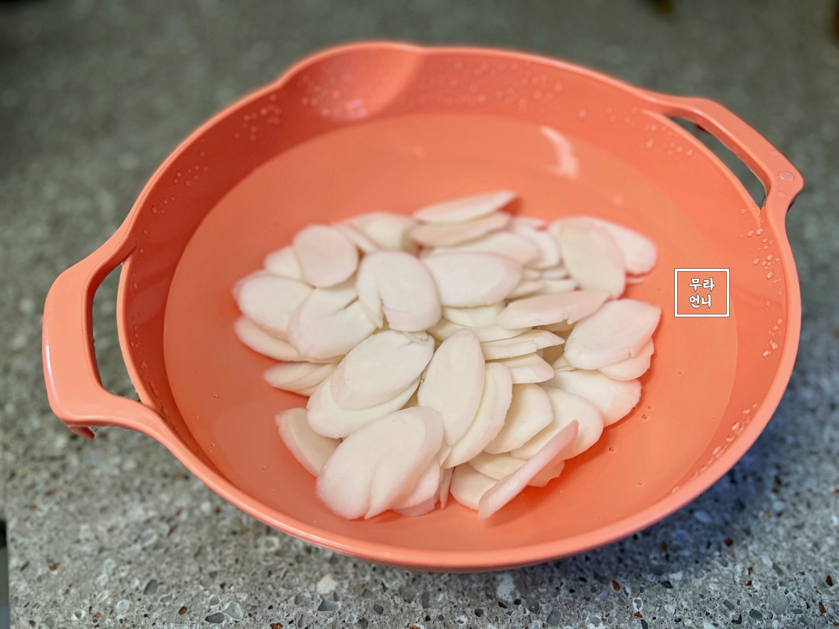 불린 떡과 만두 동시에 넣고 15분 끓이기