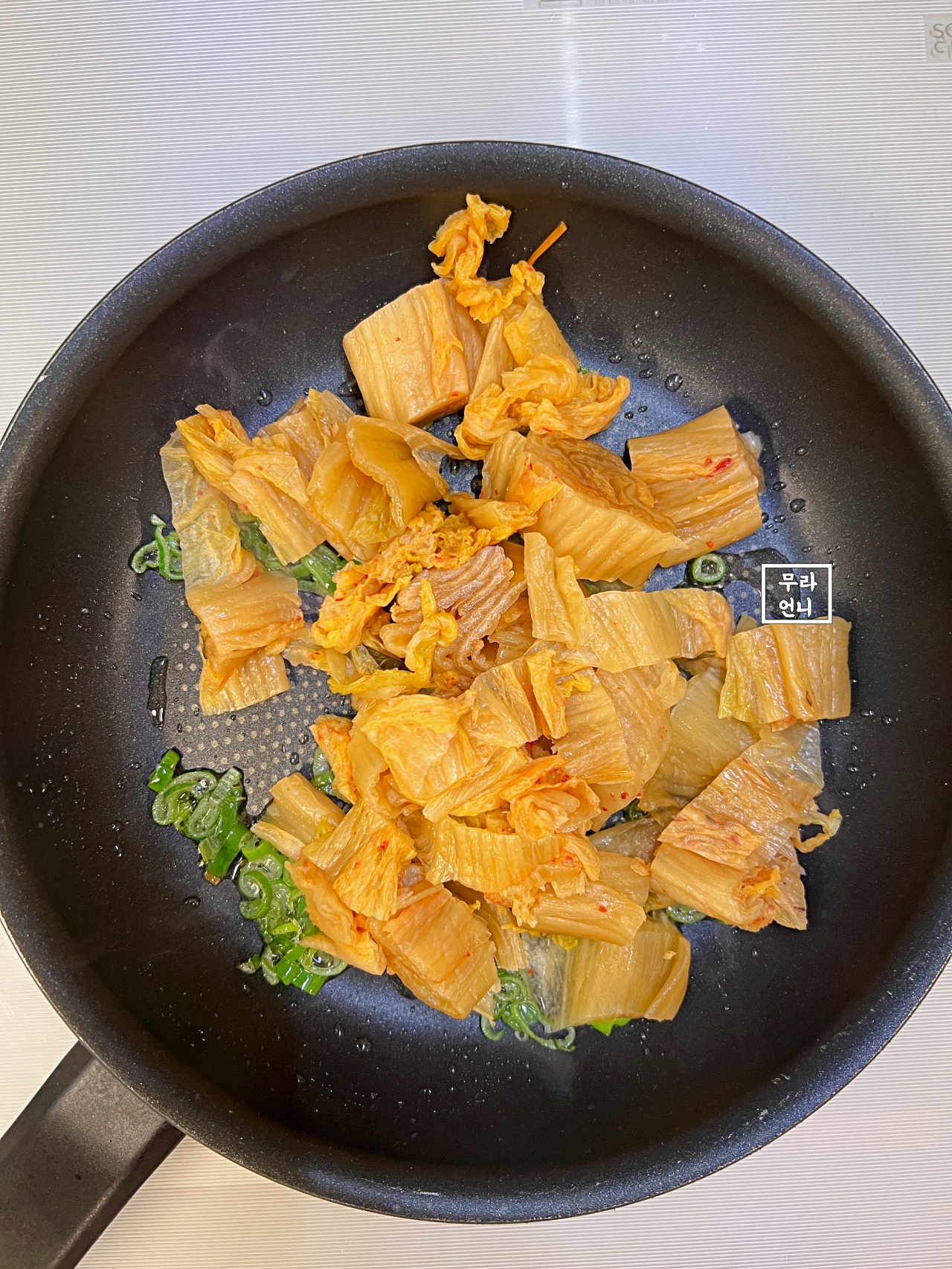 3. 기름을 넉넉히 두르고 파와 김치를 볶아 주세요