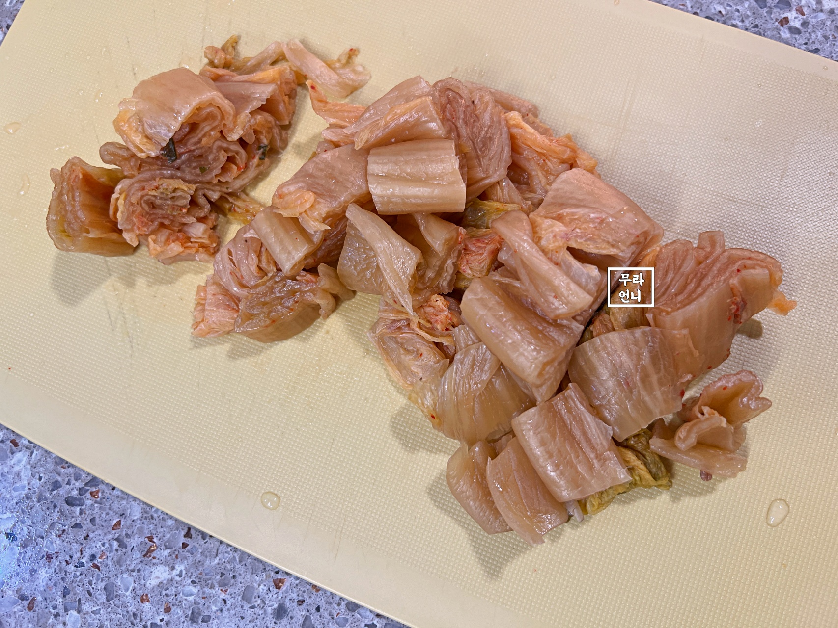 2. 잘 익은 김치 1/4포기를 물에 씻은 뒤 먹기 좋은 크기로 썰어주세요