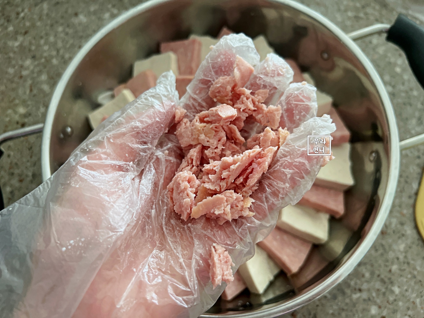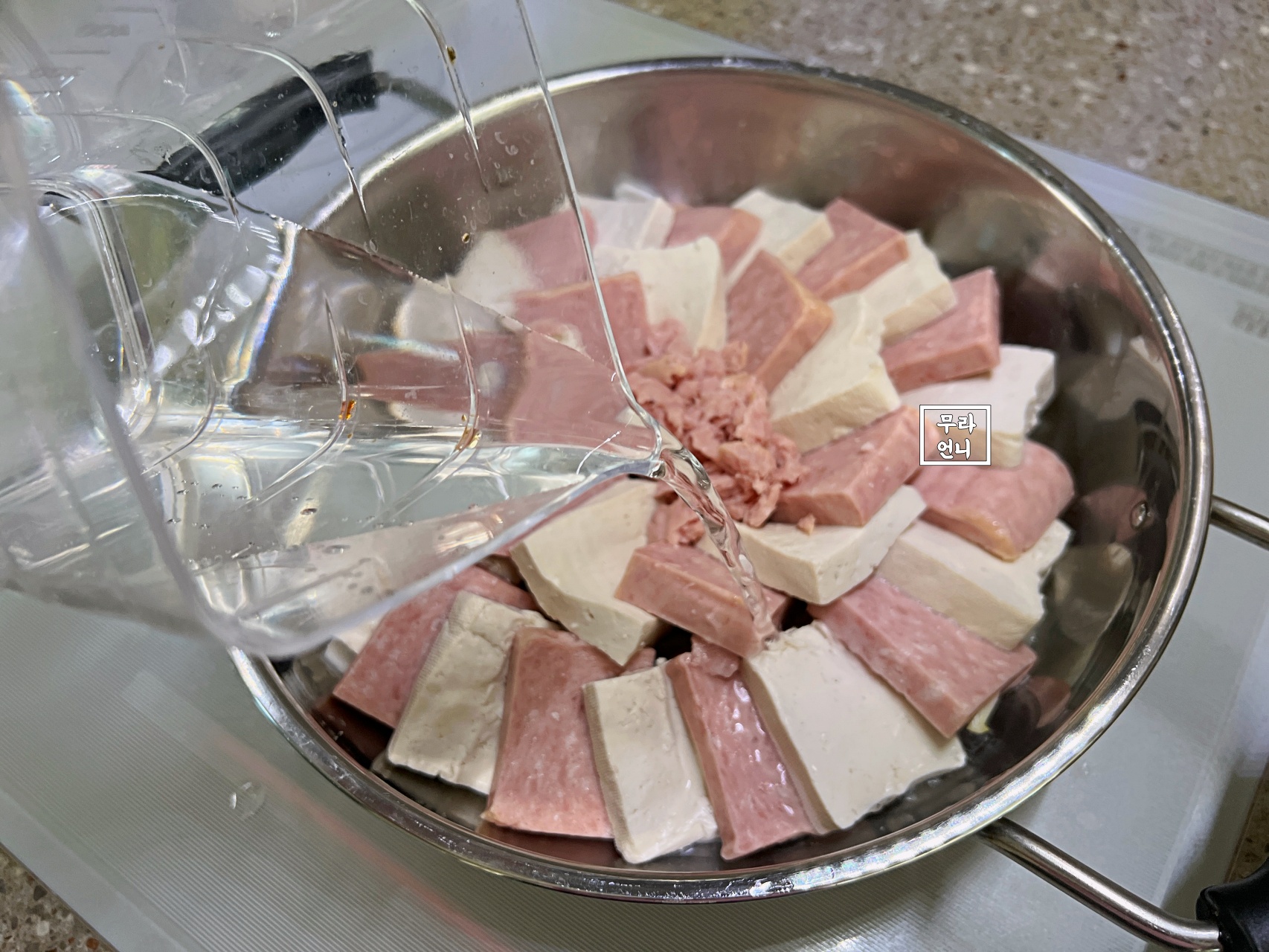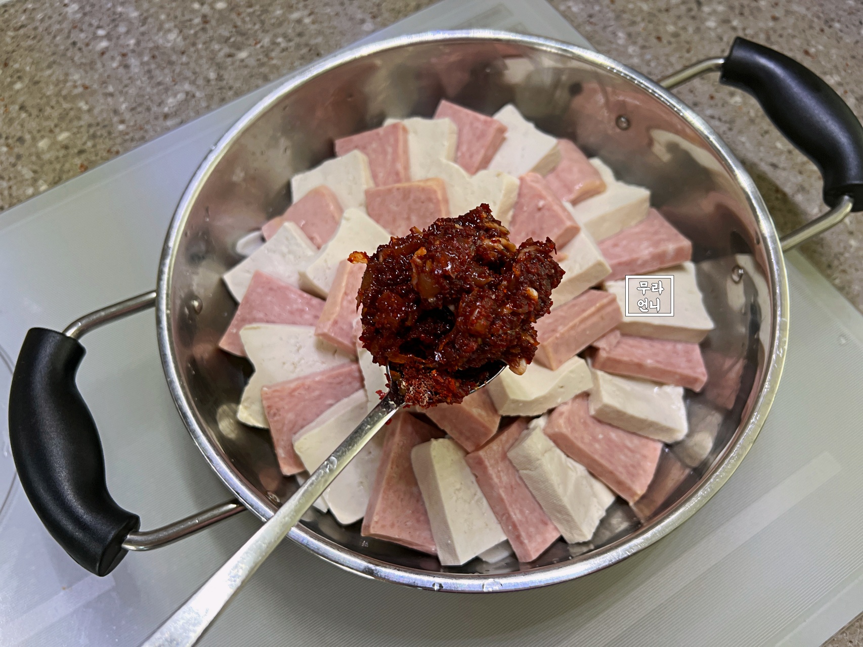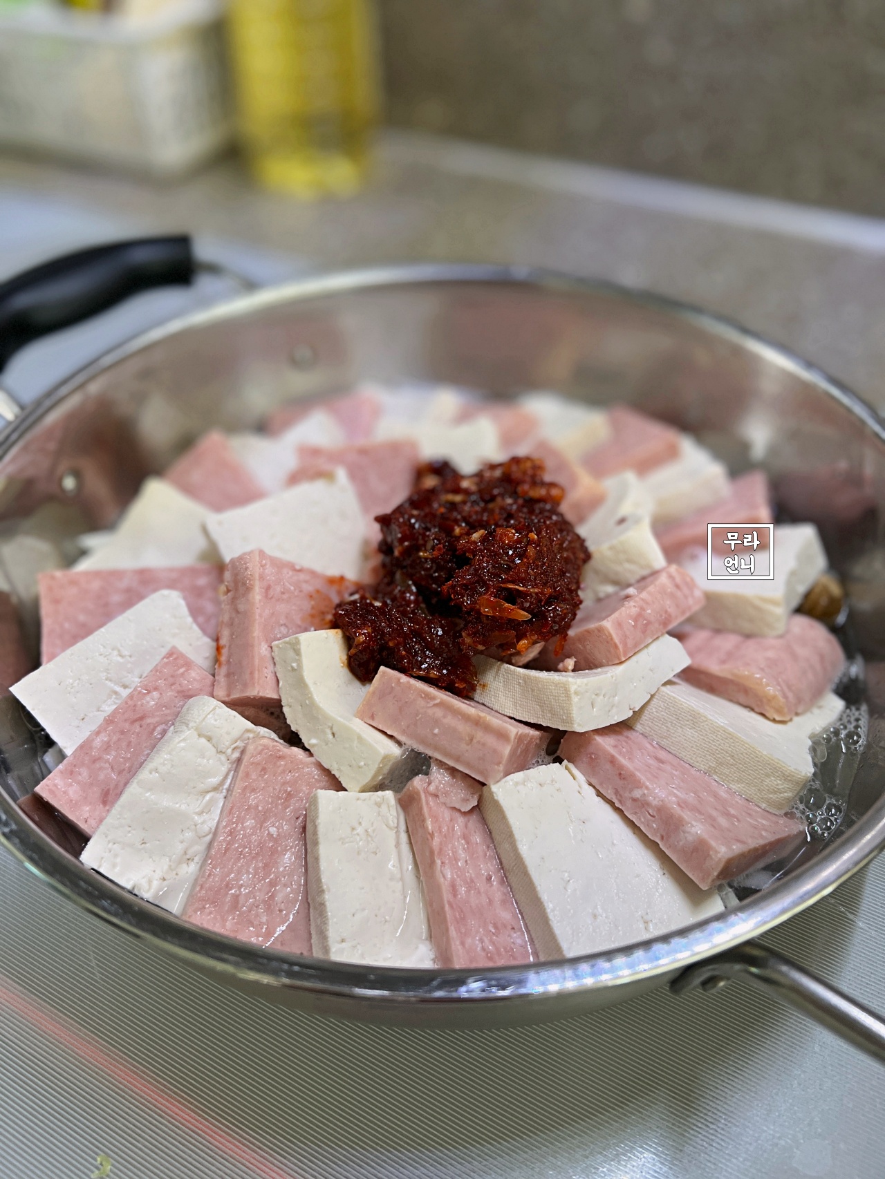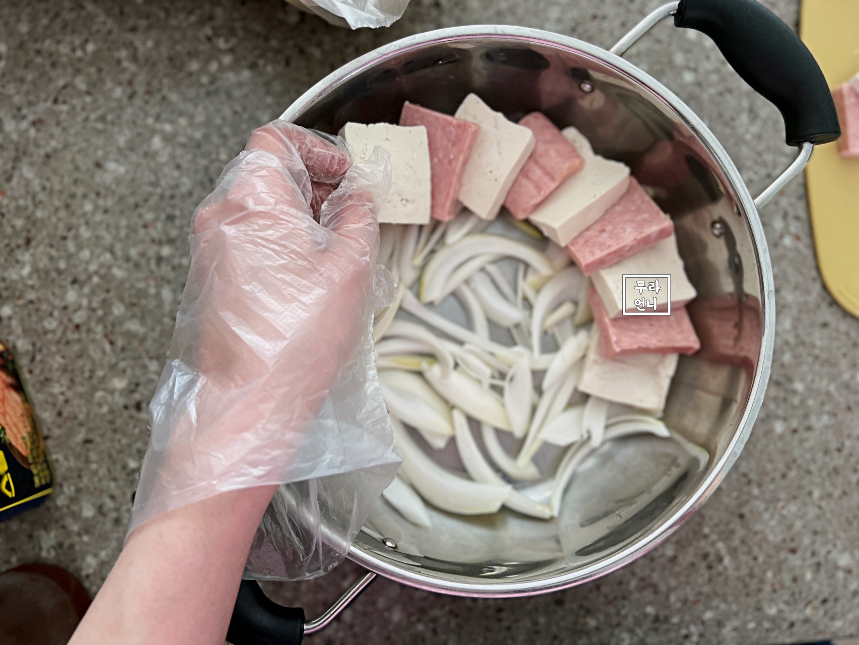 3. 양파, 두부와 햄 순으로 재료 쌓기