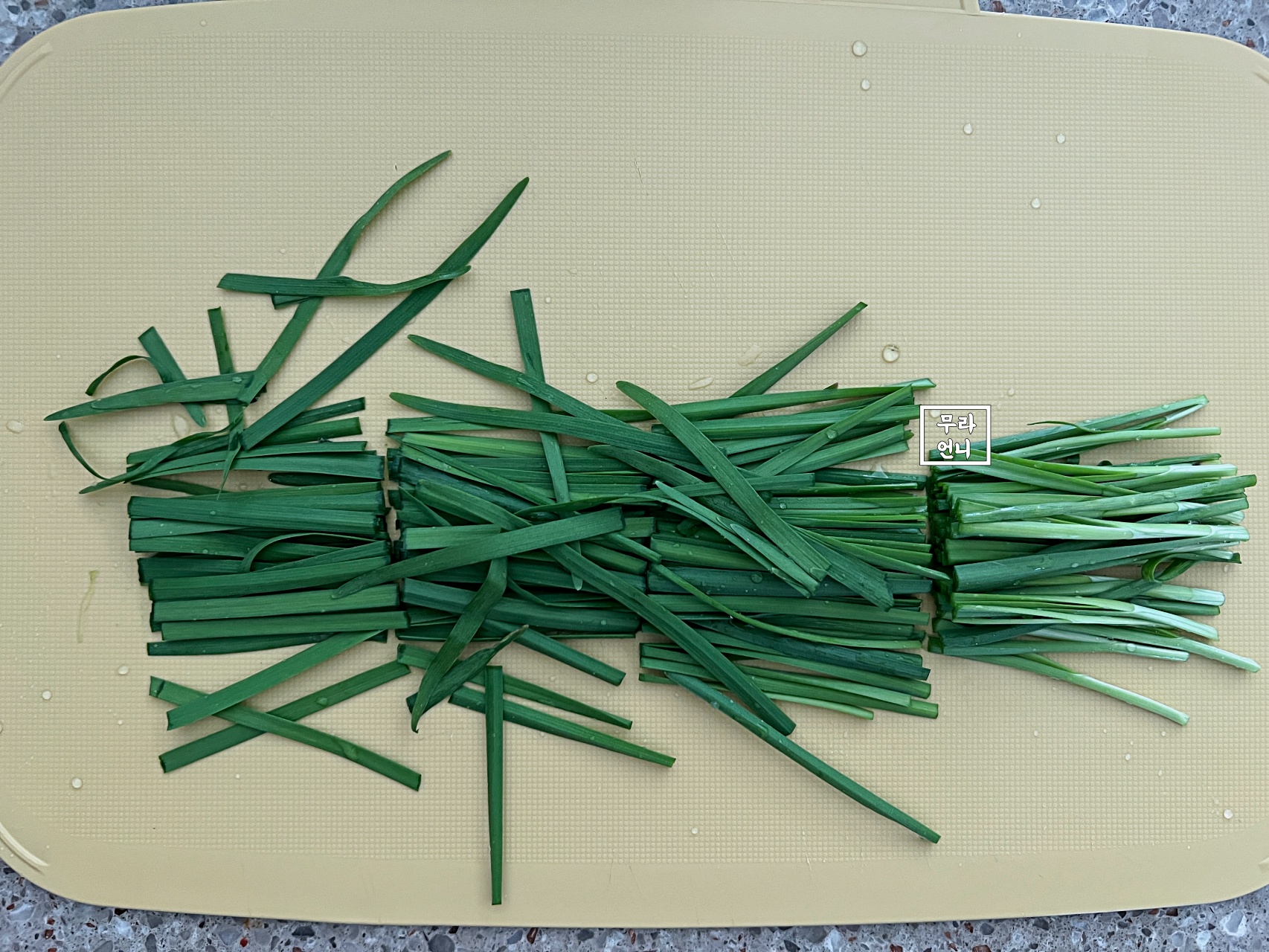 4. 부추 100g 을 손가락 두 마리 길이 정도로 썰어 주세요