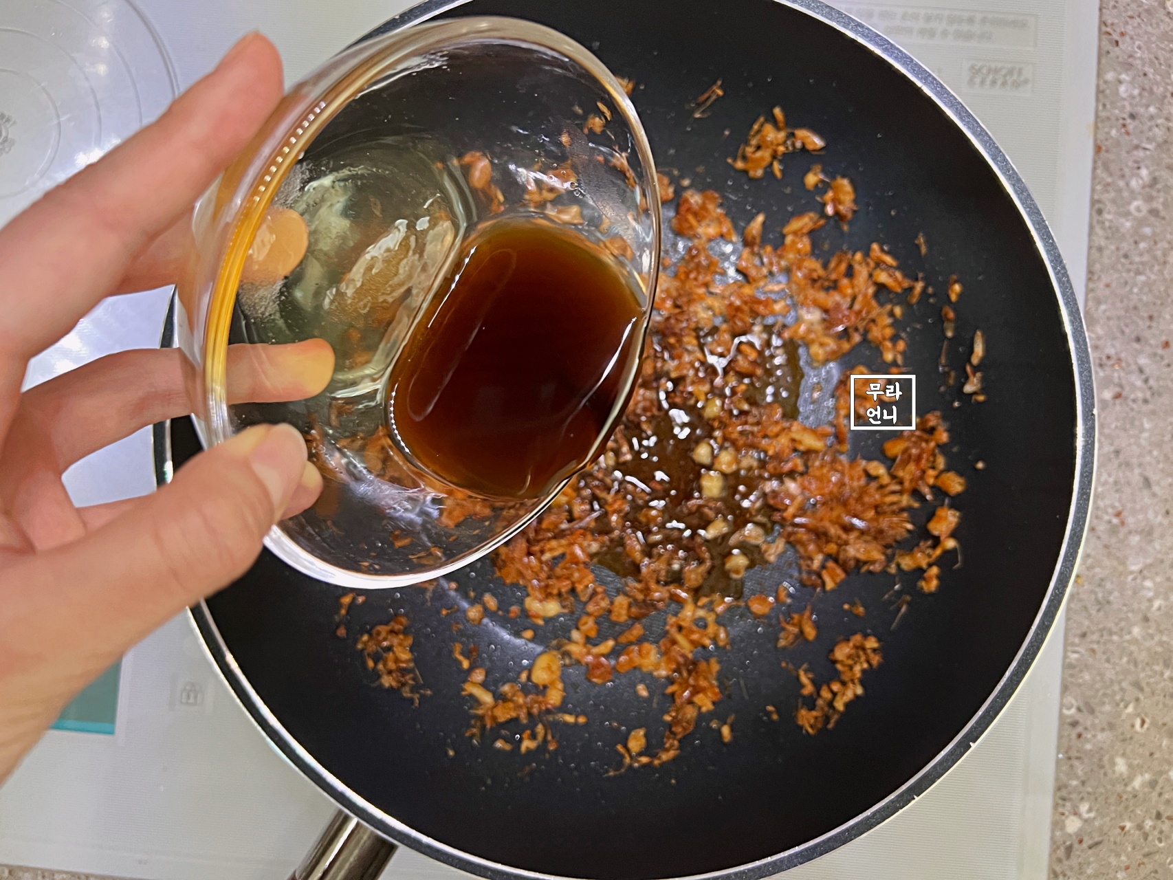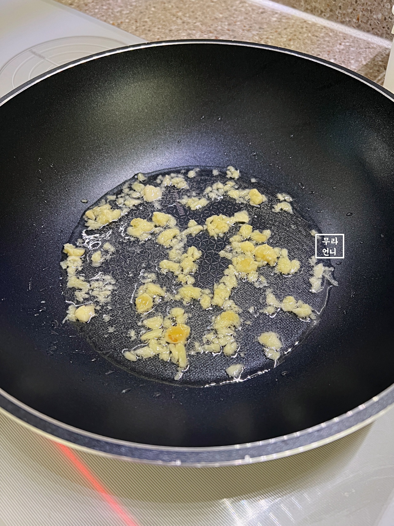 9. 기름을 두르고 다진마늘 1스푼과 건새우 먼저 볶기
