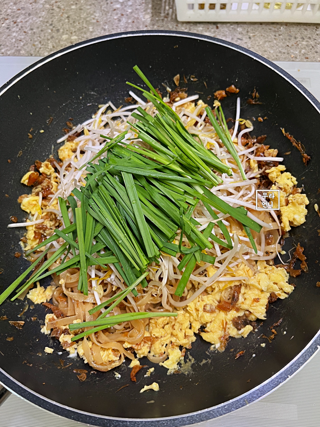 바로 숙주와 부추를 얹고 휘리릭 볶아 주세요