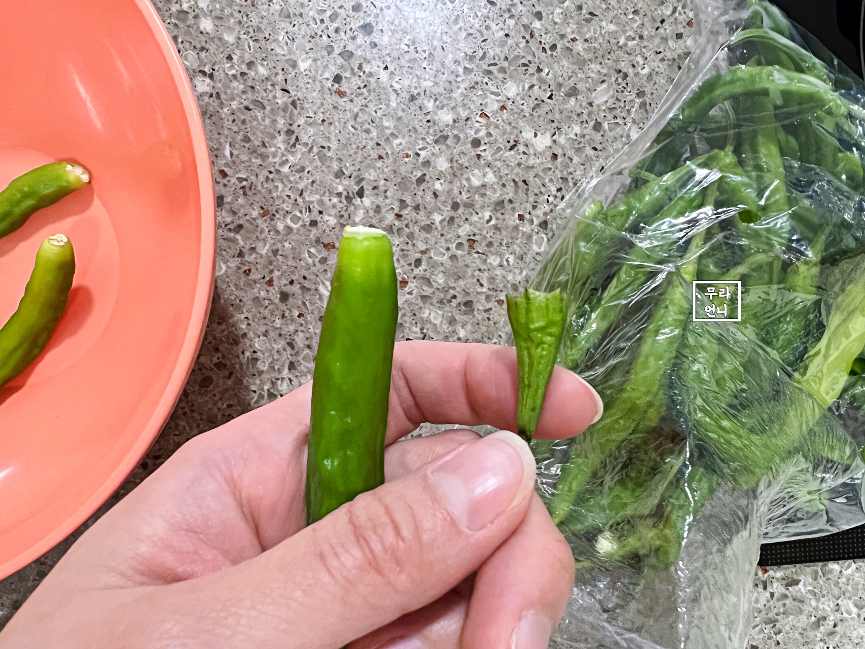 먼저 꽈리고추의 꼭지를 따는데