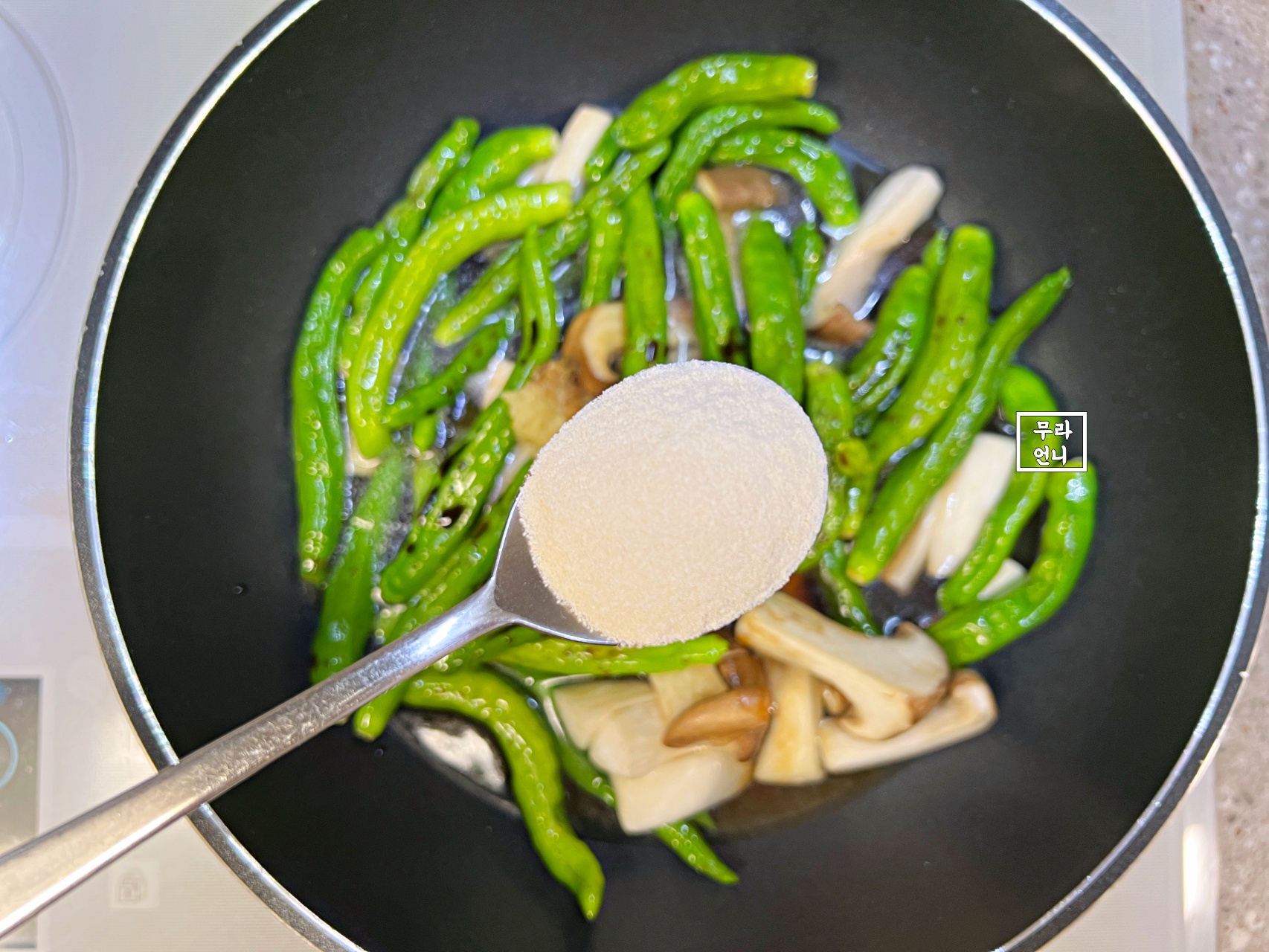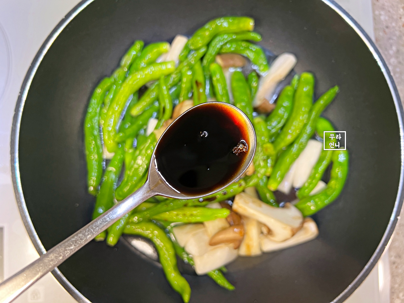 꽈리고추 먼저 넣어 살짝 볶아줄 거예요