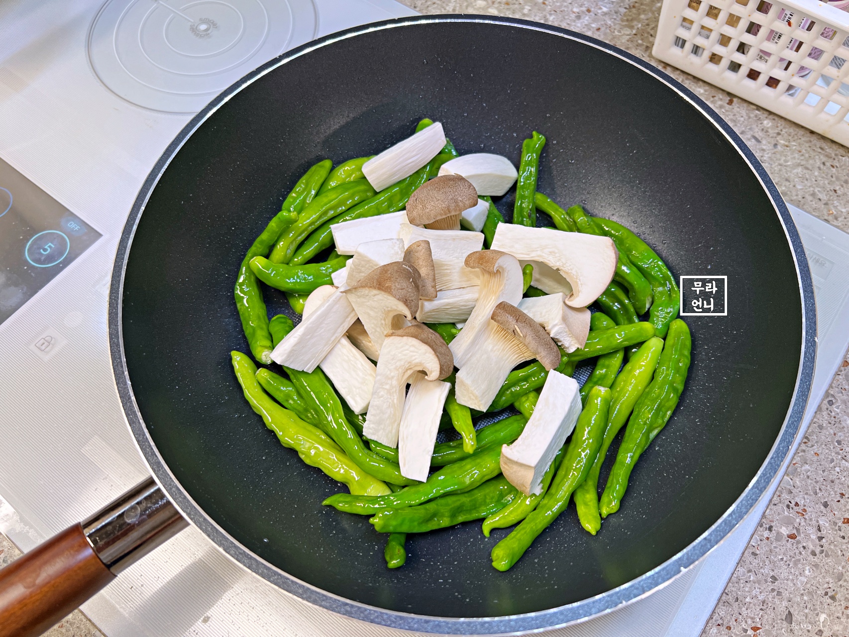 식용유 살짝 두르고 꽈리고추 먼저, 다음 버섯 볶아주기