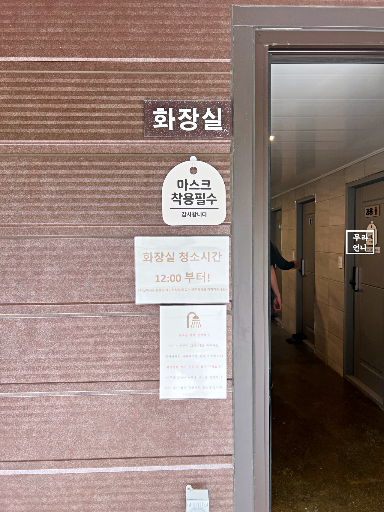 우니메이카 철원점의 경우에는 공동화장실 공간 안에 이런 문들이 쫙 있어요