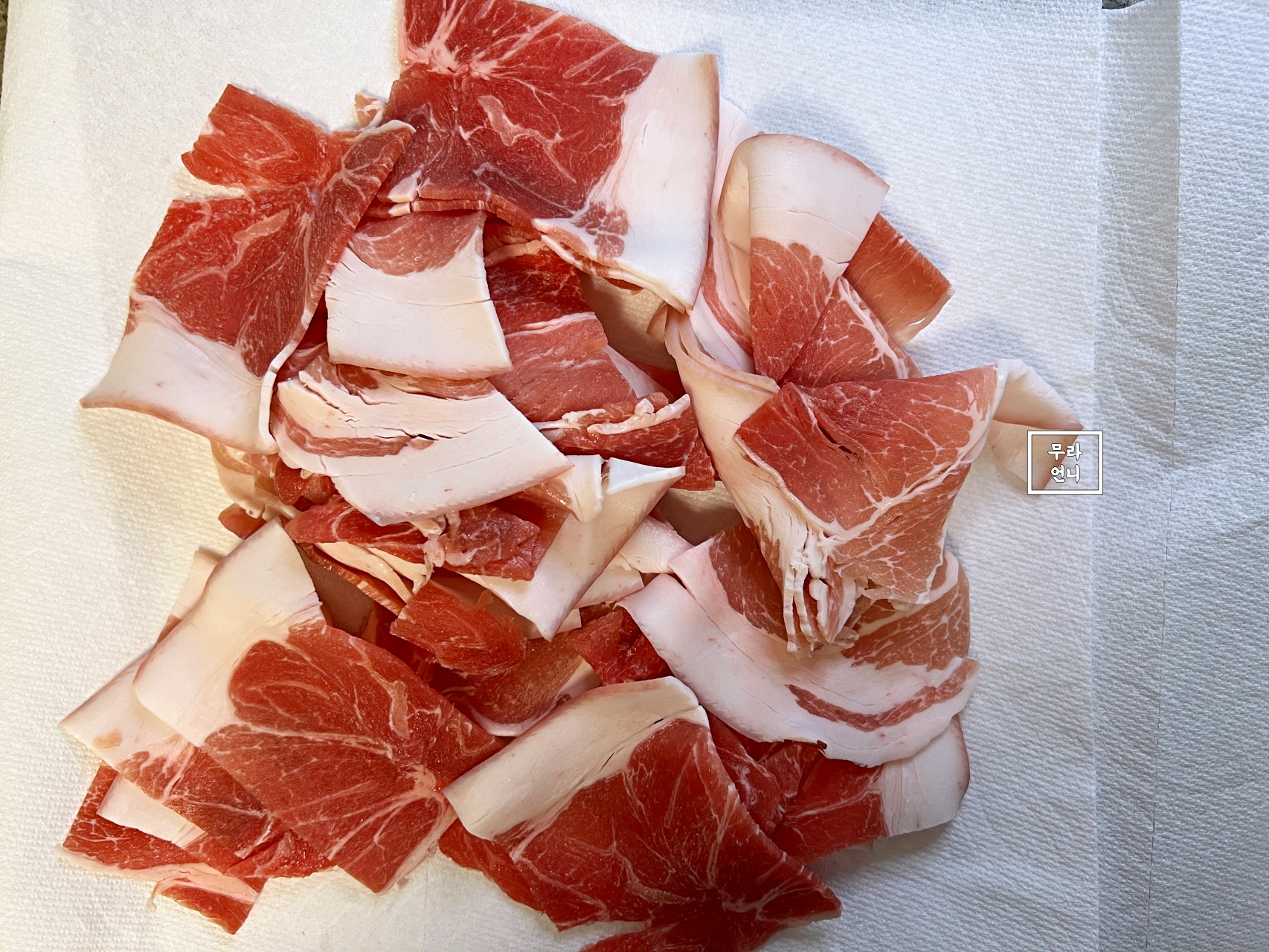 얇은 고기니까 최대한 펴서 올리면 좋아요