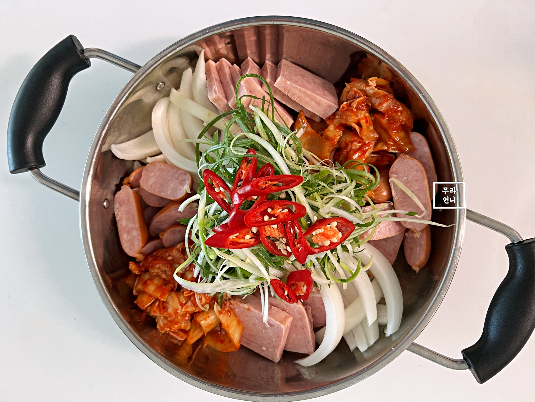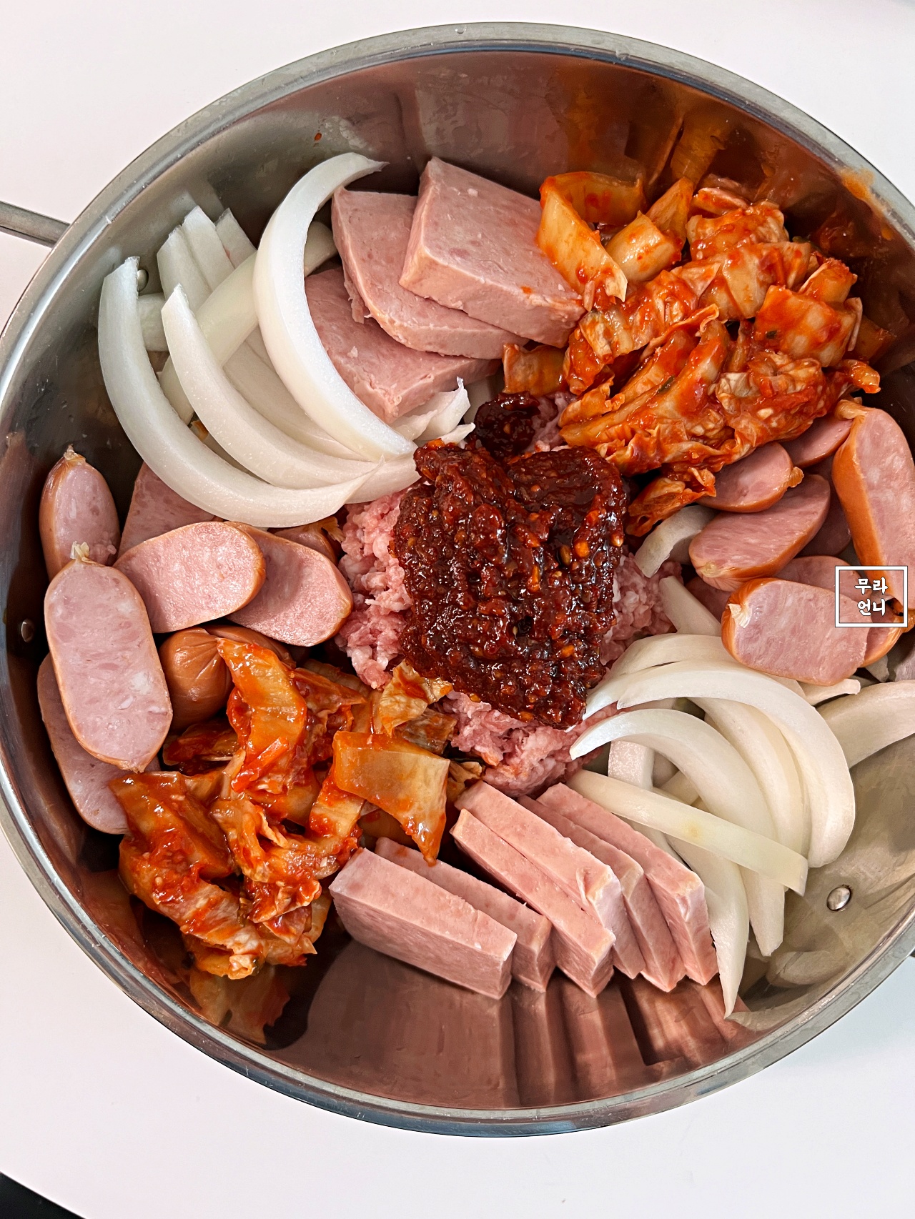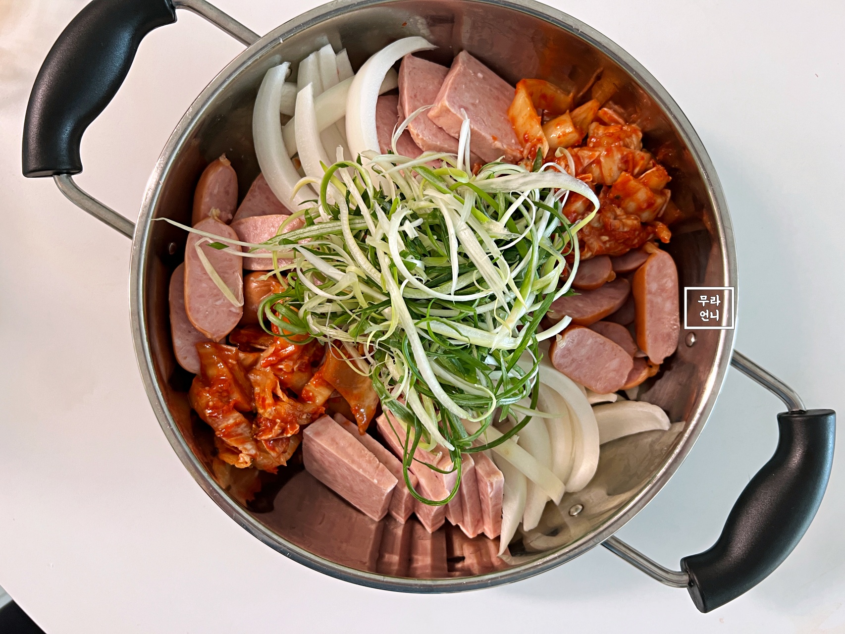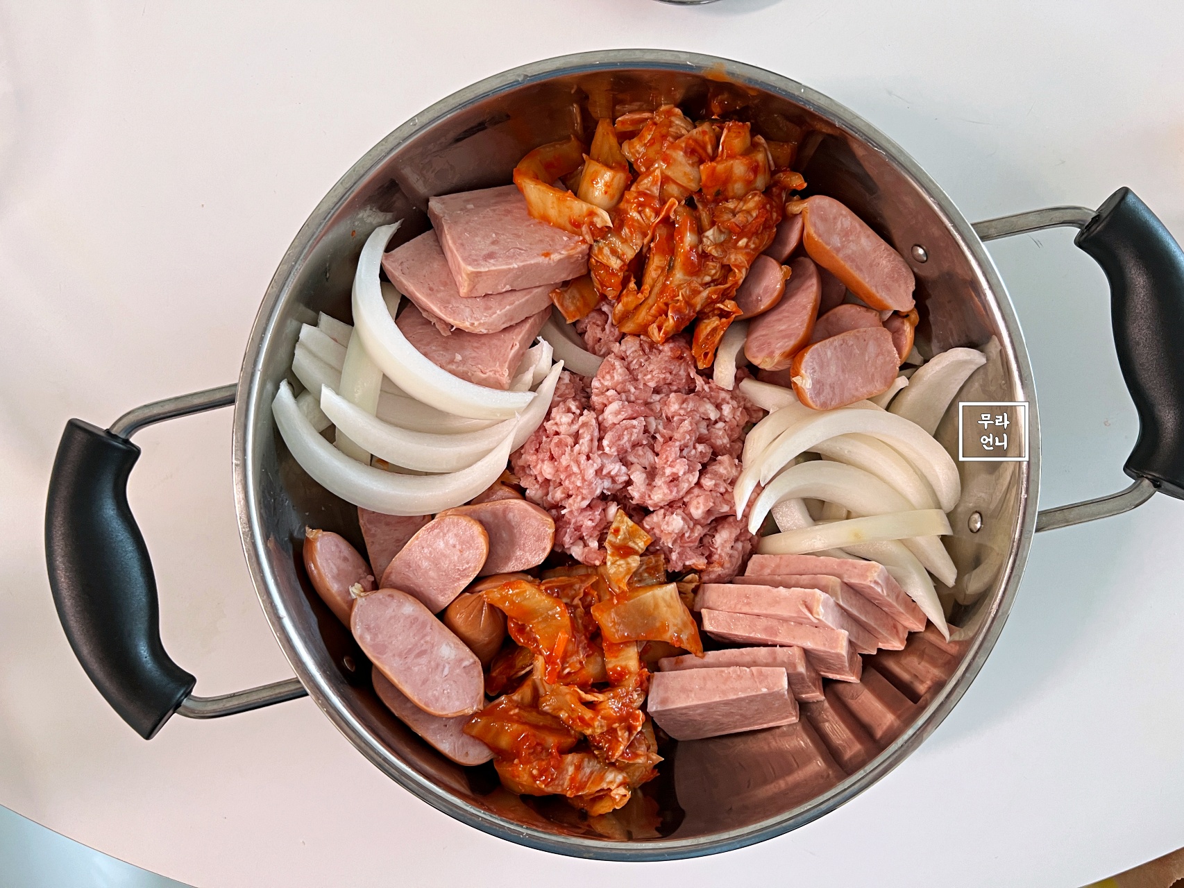 부대찌개 냄비에는 재료를 먼저 담은 뒤