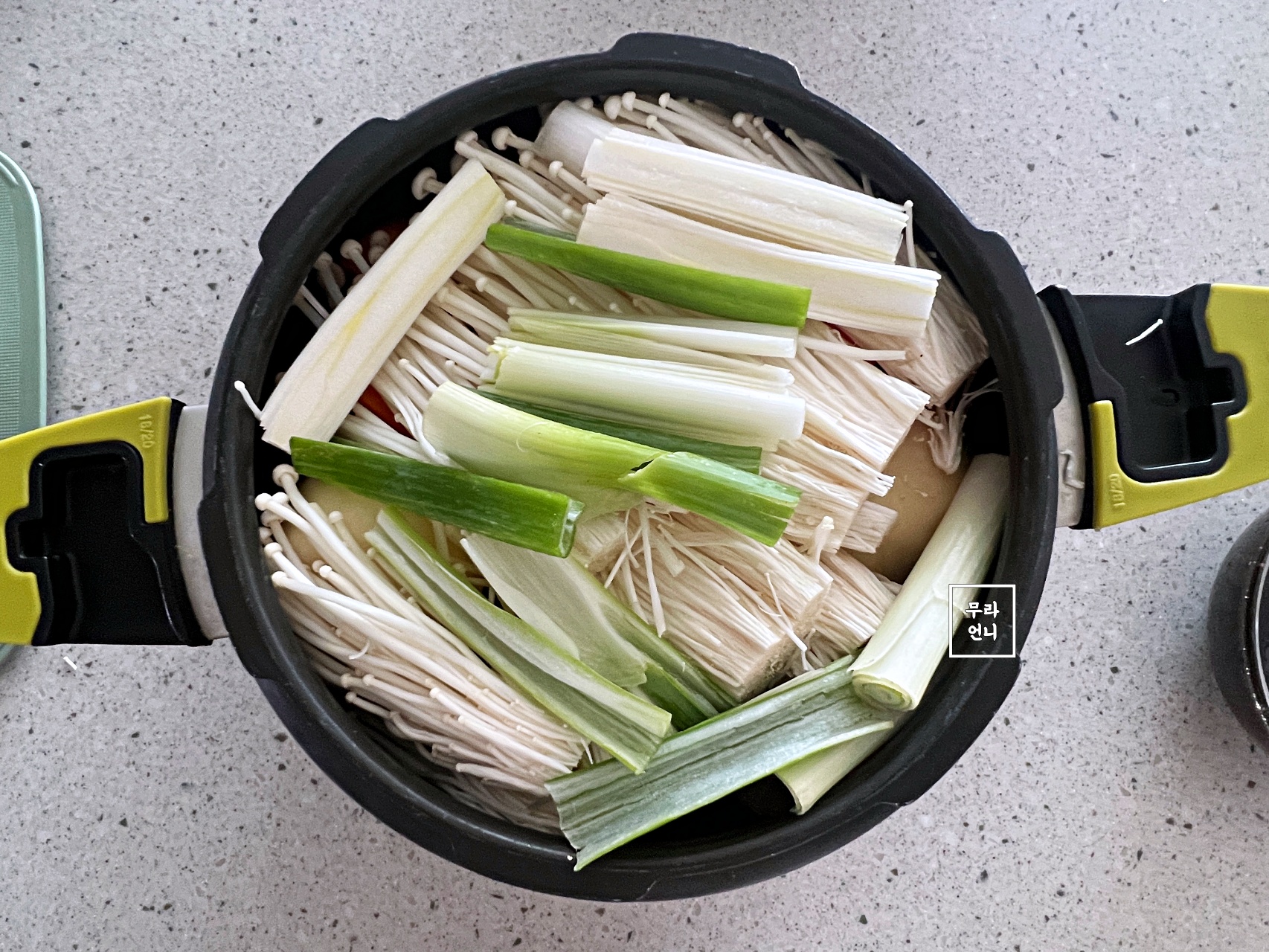 대파, 팽이버섯을 차례대로 올렸습니다