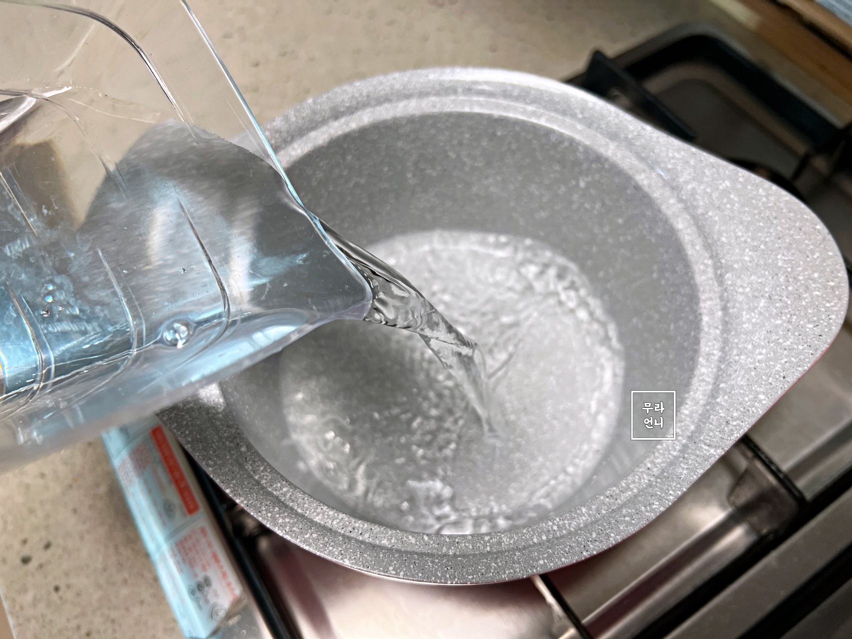 끓지 않는 물에 육수팩을 담고 같이 끓이기 시작해서