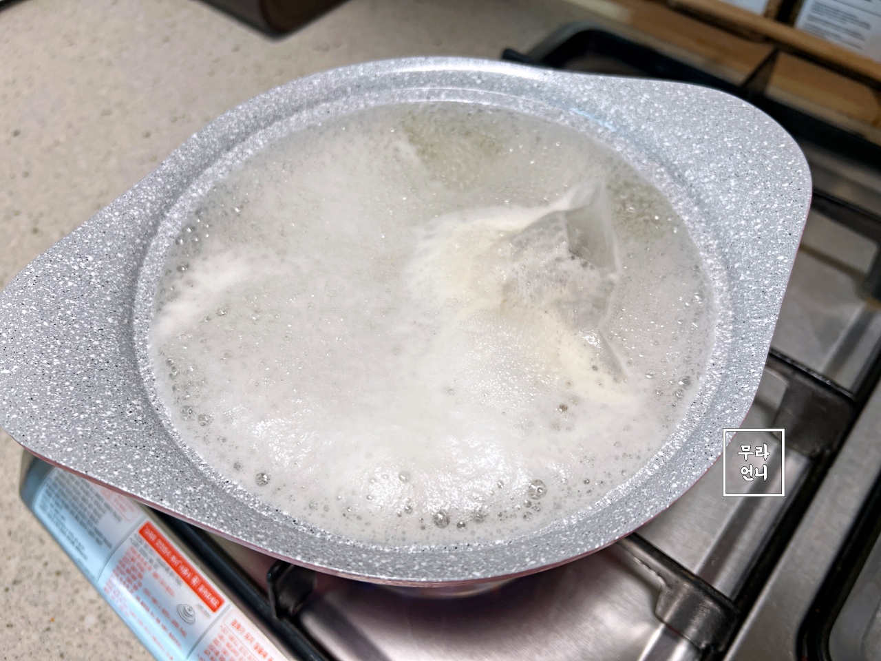 끓고 나면 10분 뒤에 육수팩을 건져주면 돼요