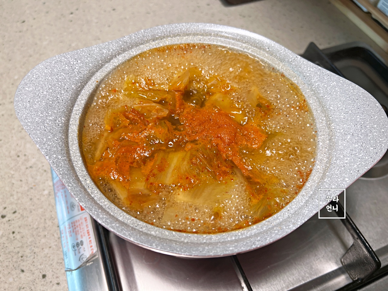 육수에 넣고 푹 끓이는 방식으로 김치찌개를 만들어 볼게요