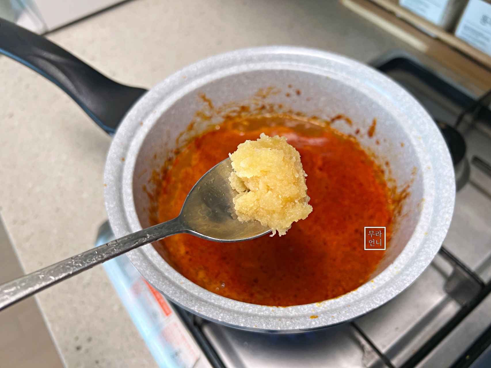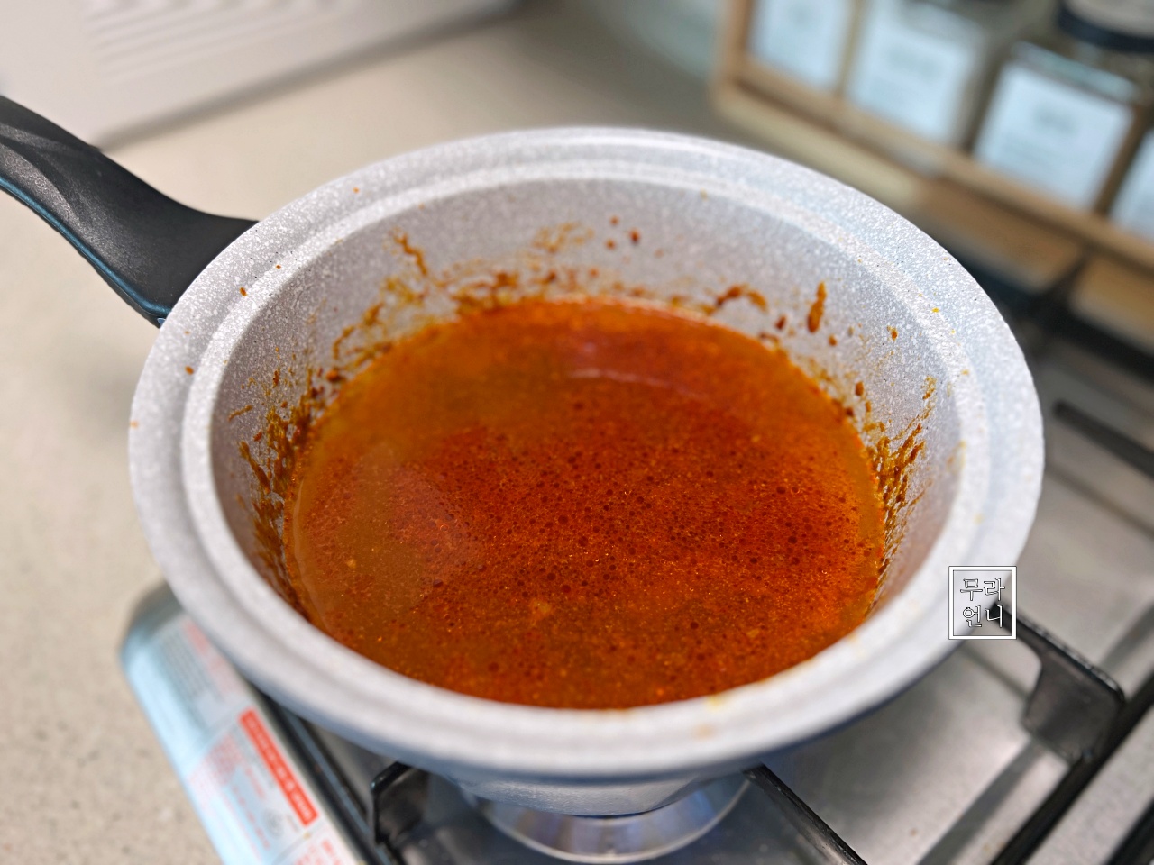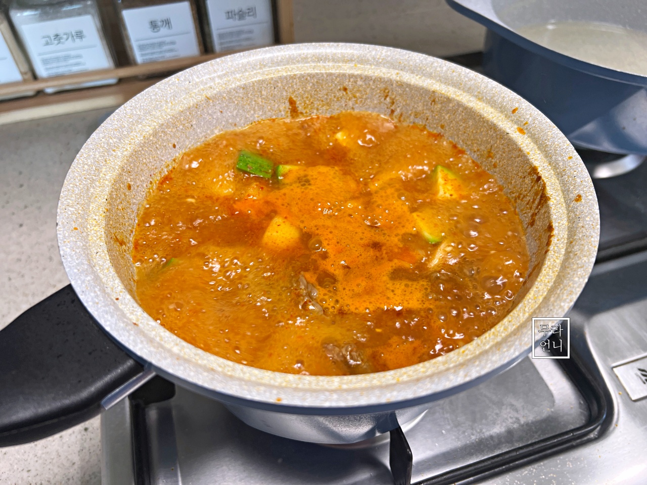 고춧가루를 넣고 냄비 바닥면이 지글지글 끓으면
