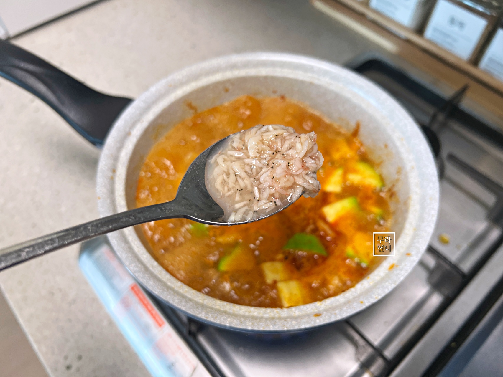 때문에 지금 새우젓 반 스푼 넣고