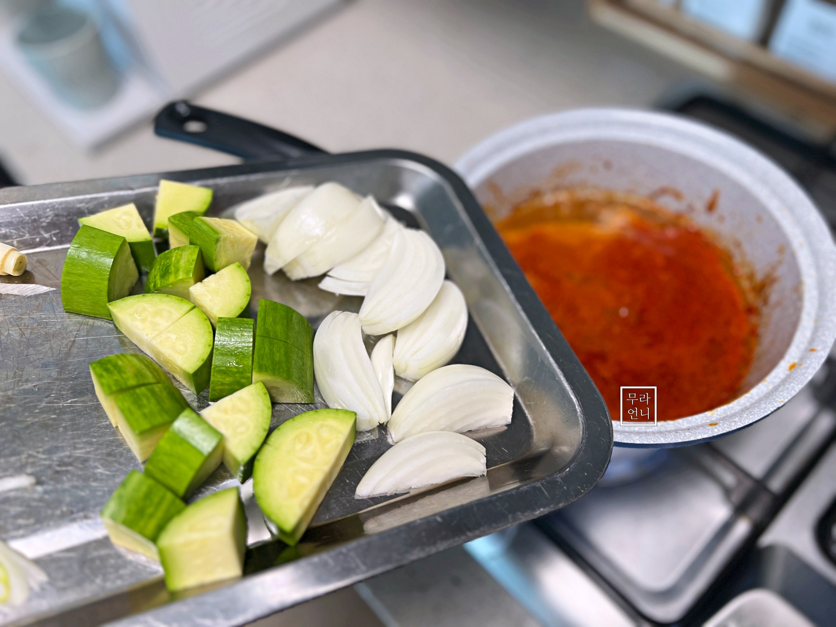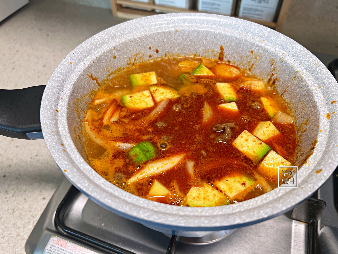 애호박, 양파를 넣고 센 불에서 끓여줍니다
