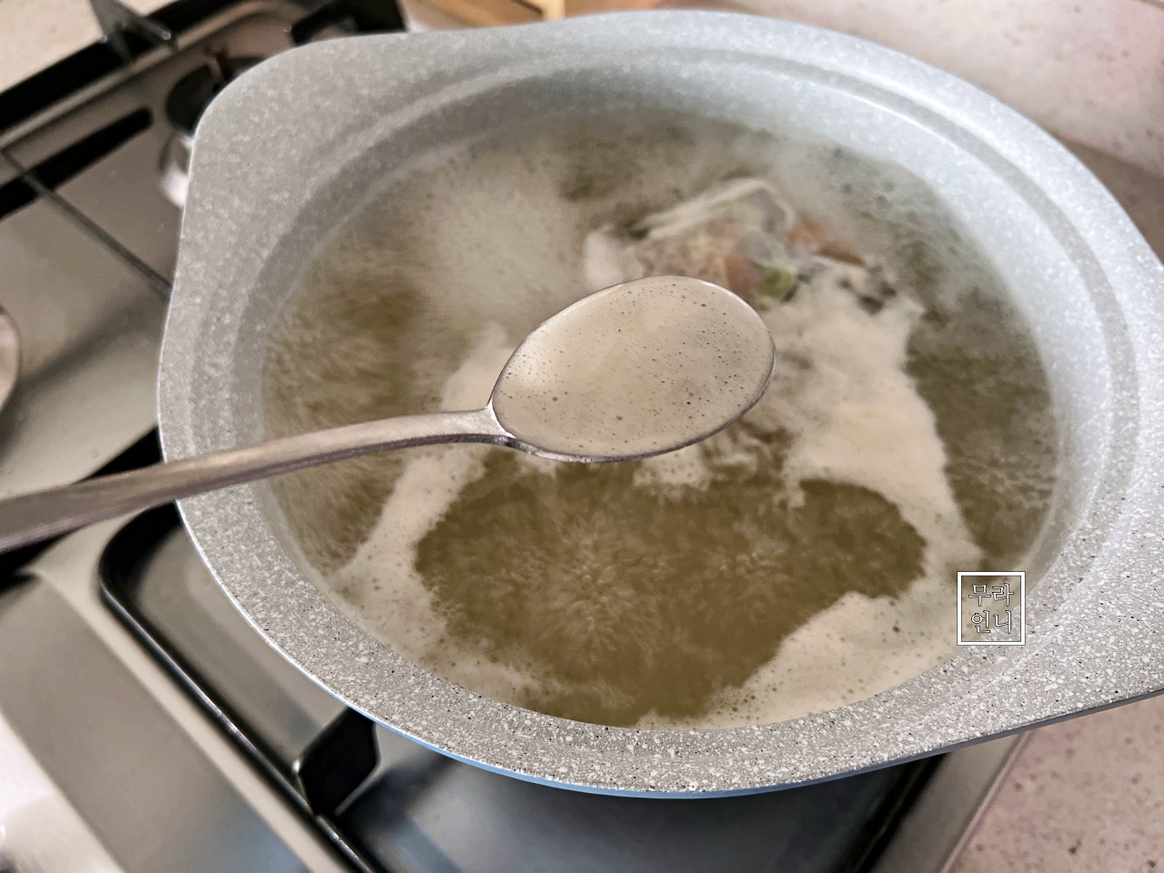육수팩 때문에 올라온 거품을 깨끗하게 걷어주세요