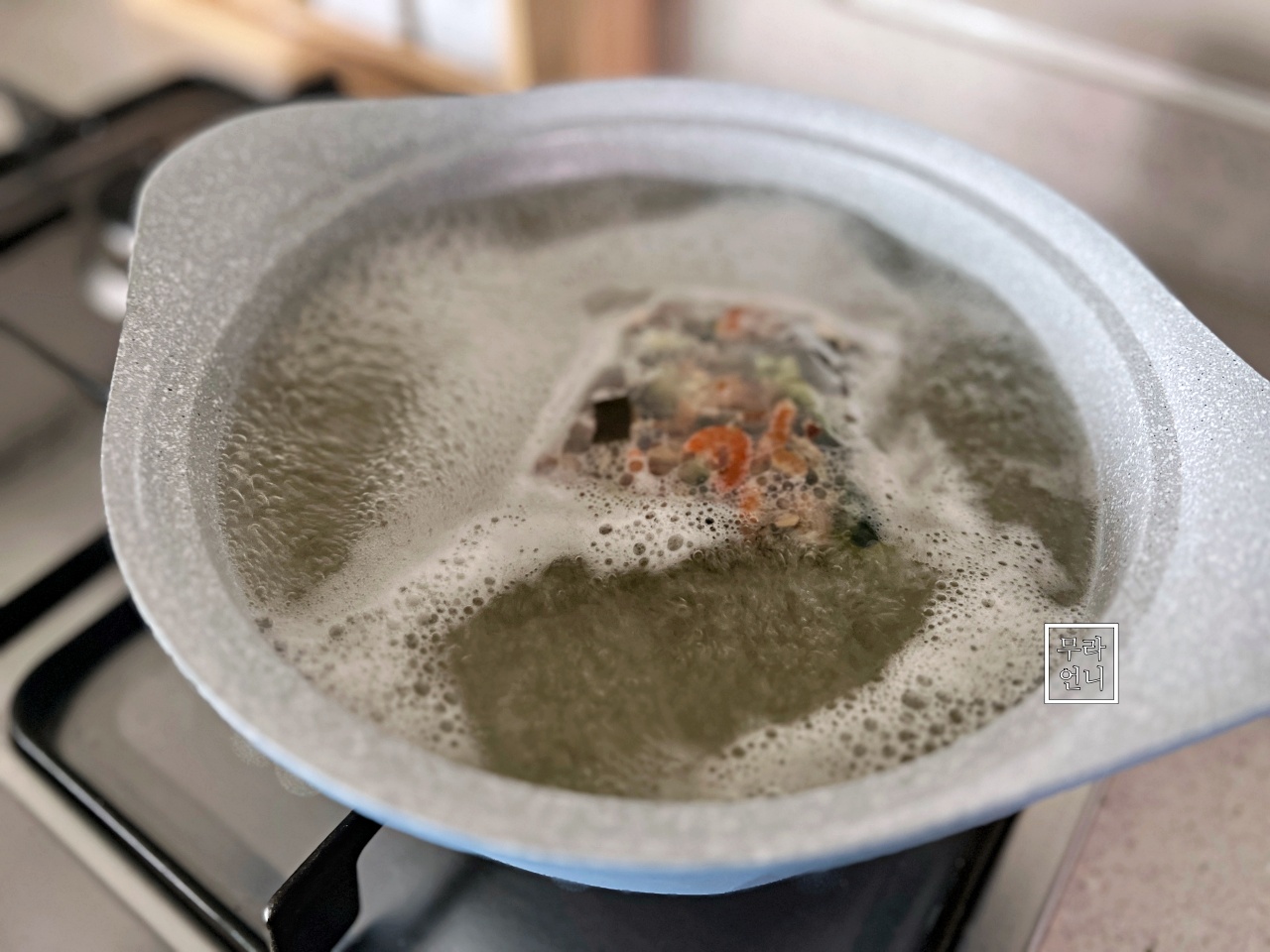 1) 찬물에 육수팩을 넣고 센 불에서 끓이기 시작합니다