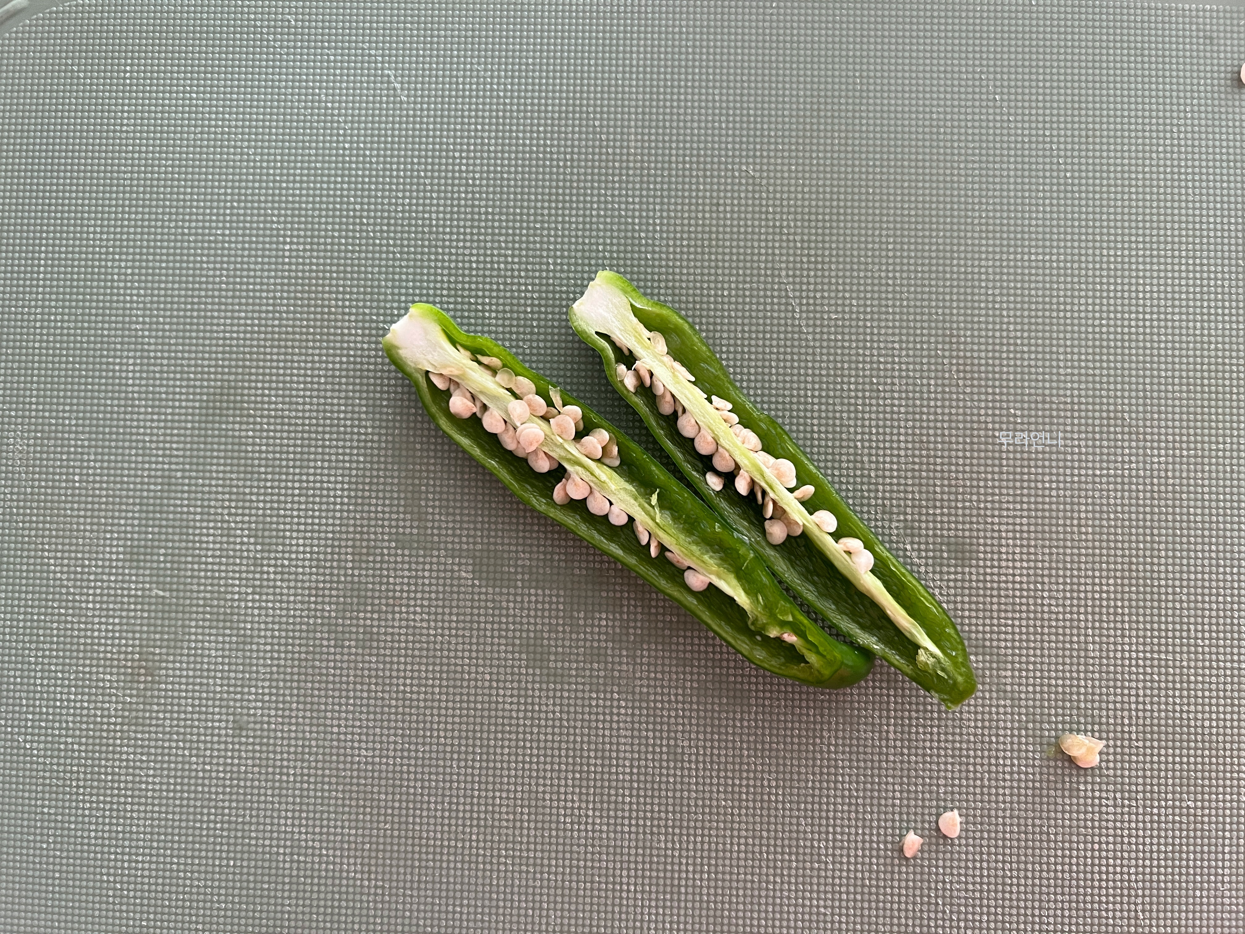 고추를 반으로 가른 뒤 고추씨를 빼줍니다