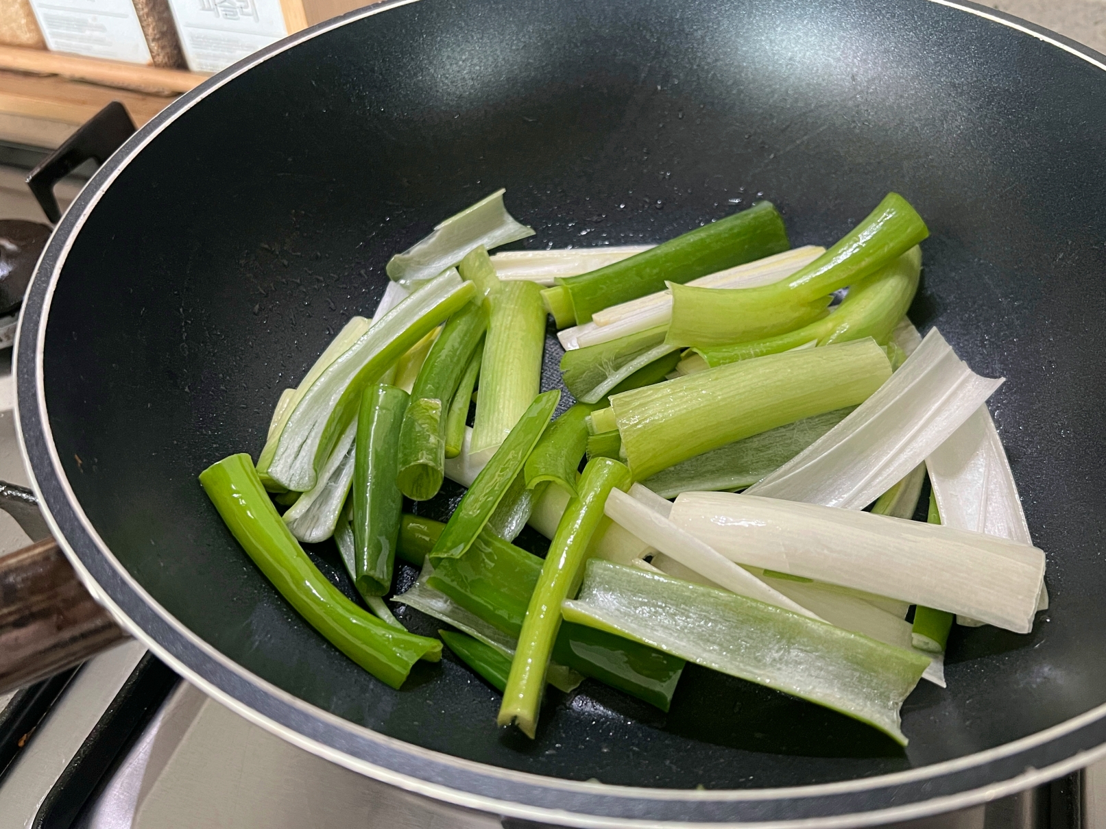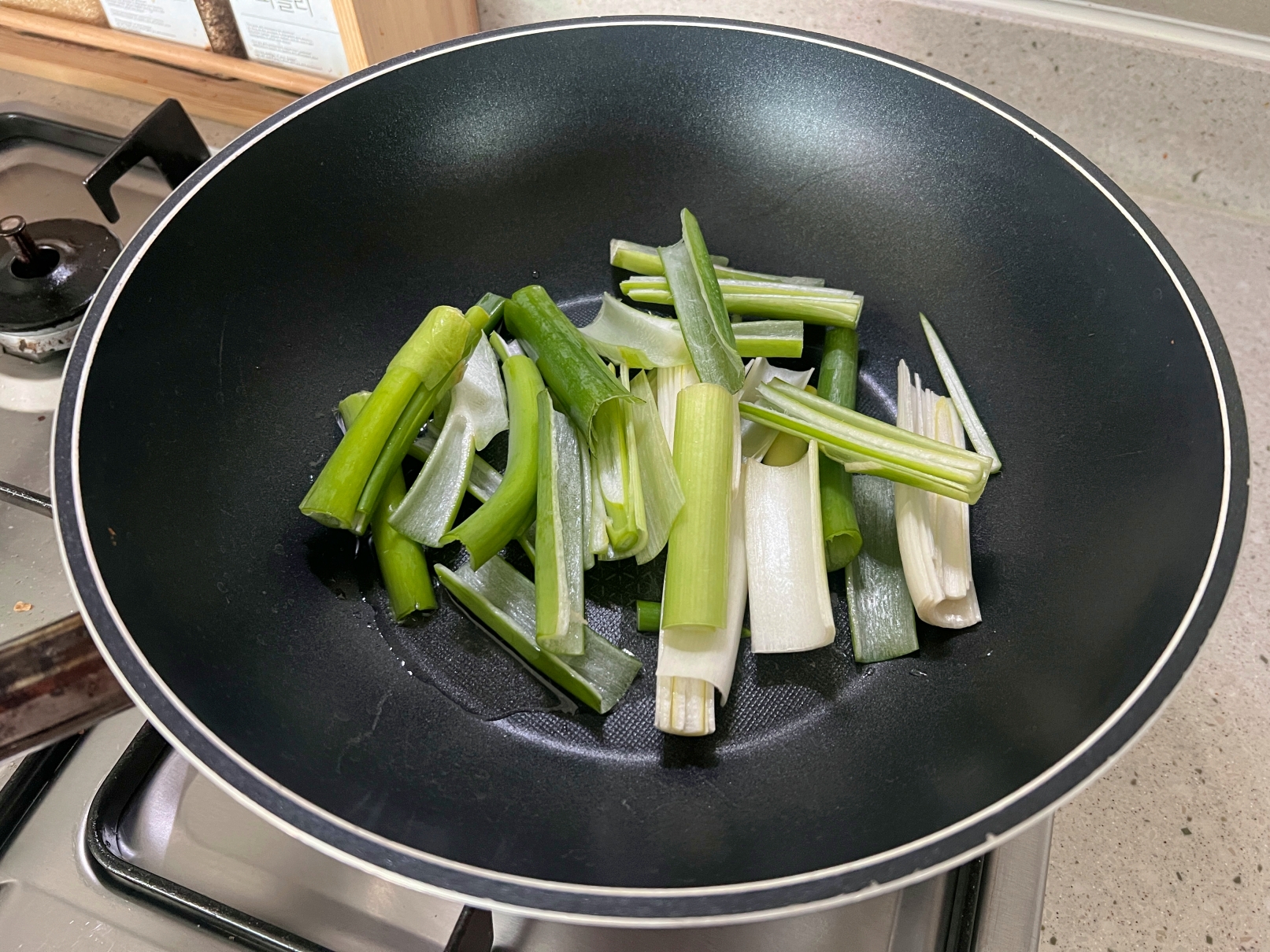 기름을 넉넉히 두르고 대파 먼저 볶기