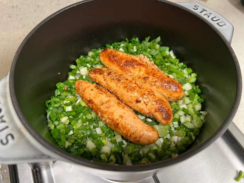 김이 다 빠져나가기 전에 빠른 속도로 명란과 쪽파를 넣어주고 5분 동안 뜸을 들입니다