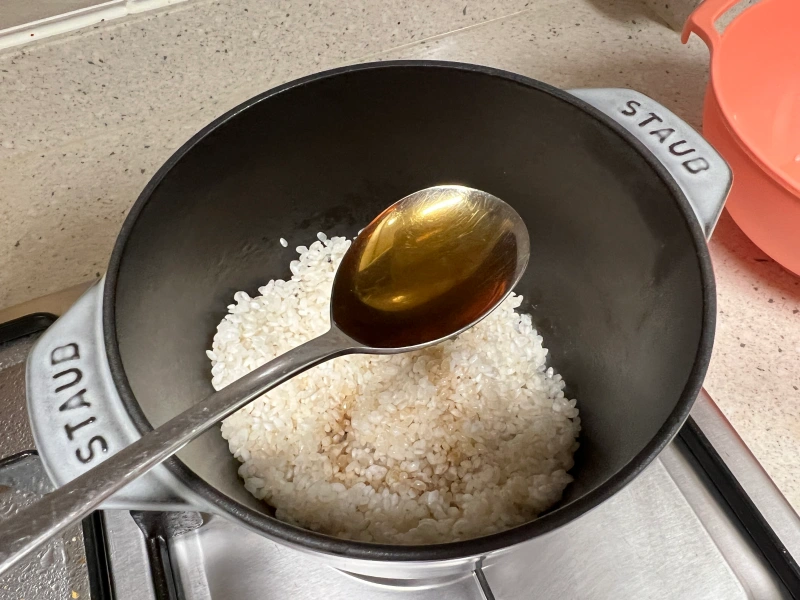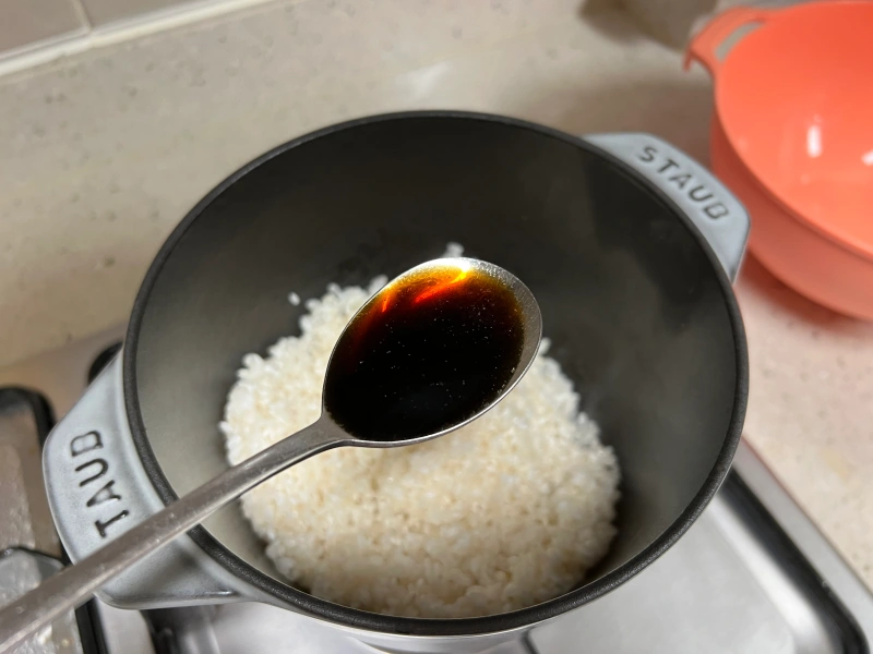 간장 1스푼, 맛술 1스푼, 액젓 1스푼 넣고 쌀과 잘 섞어주세요