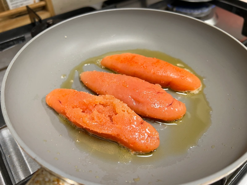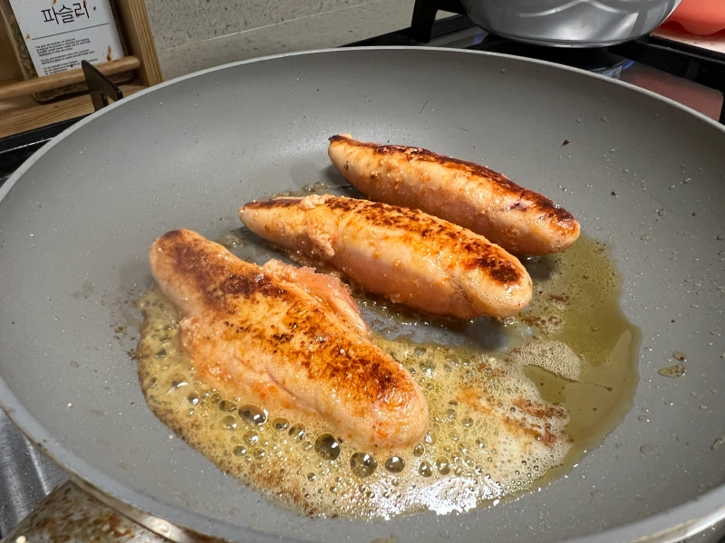 명란 구울 때에는 들기름 둘러서 고소한 향을 더했고, 약불에서 구워야 명란이 타지 않아요