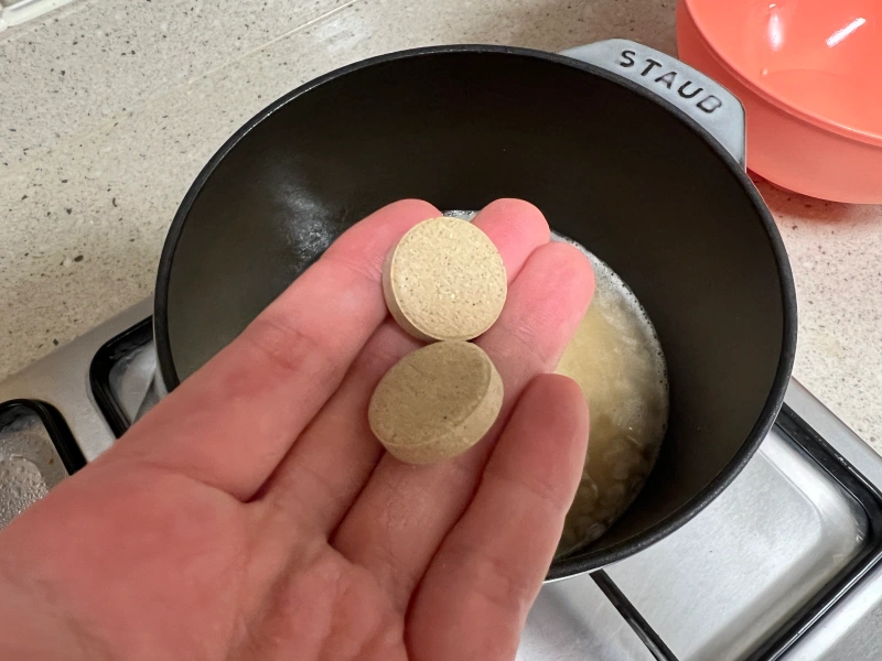 물을 넣고 멸치육수환 2개를 넣어서 휙휙 섞어준 뒤 끓어오를 때까지 계속 끓여줍니다