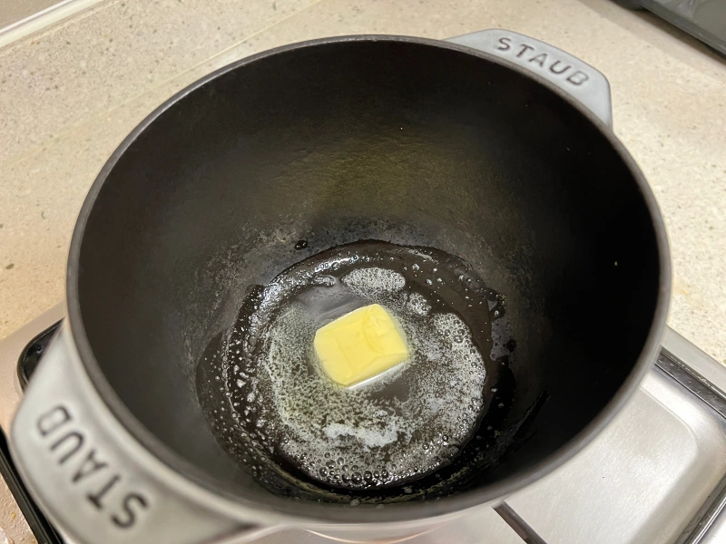 중약불에 버터를 넣고 버터가 녹을 때쯤 불린 쌀을 넣고 잘 섞어주세요