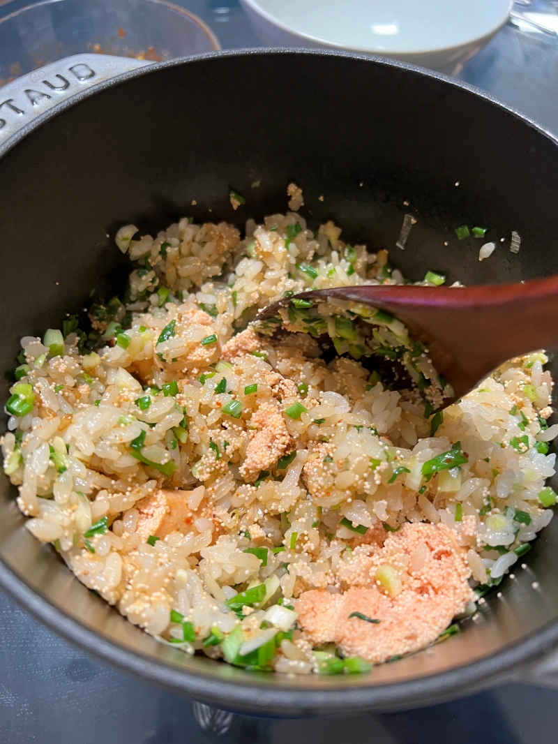 명란솥밥 완성, 명란을 으깨 밥과 잘 섞어서 드시면 됩니다