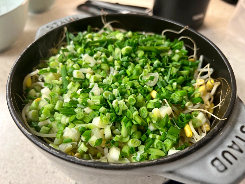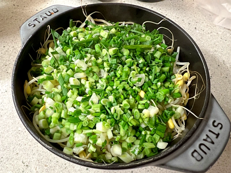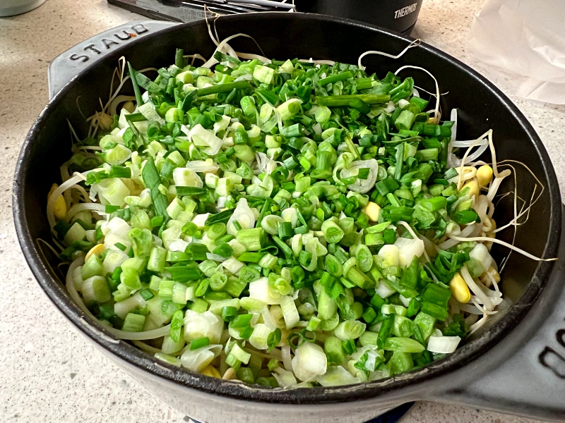 김이 너무 많이 나가면 안 되기 때문에 뚜껑 열고 쪽파는 빠른 시간 내에 넣어 주고 뜸을 들입니다