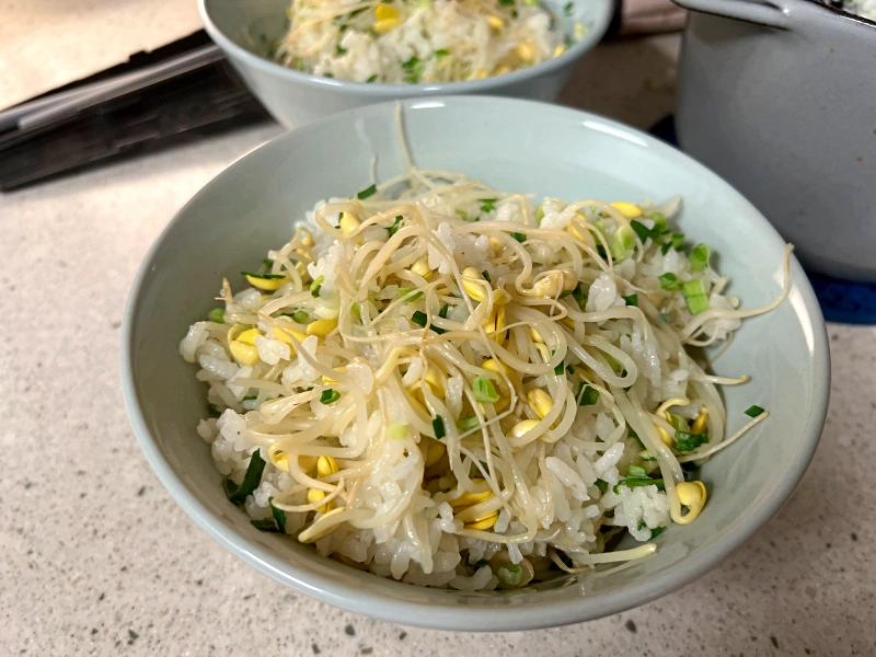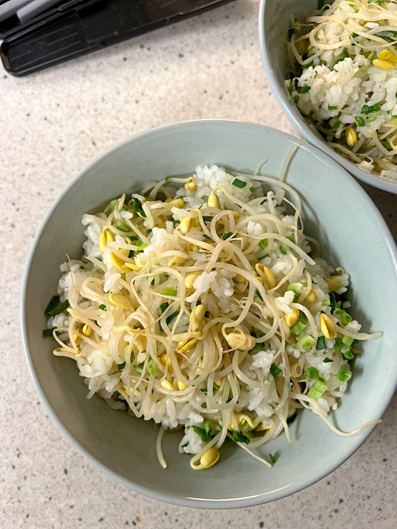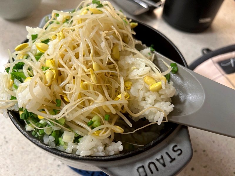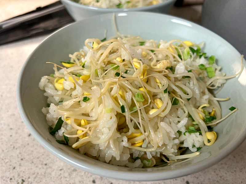 그리고 2분 동안 뜸을 들이고 나면 콩나물밥 완성이에요