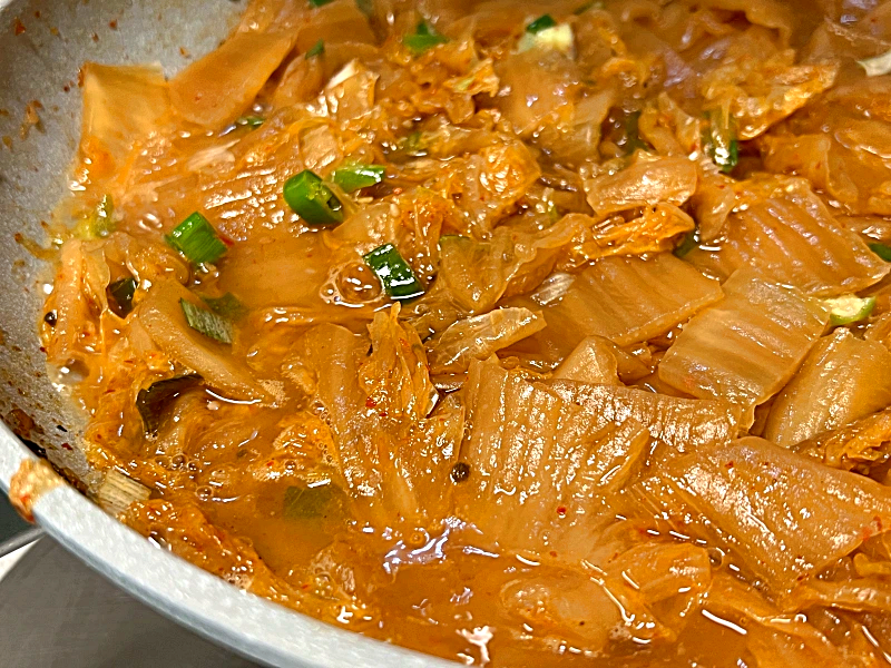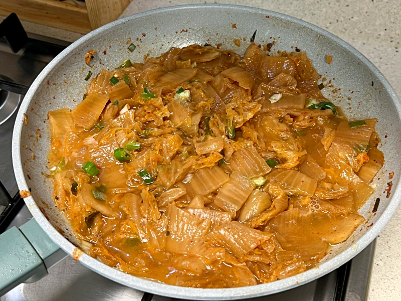 김치를 볶다보면 아무래도 물기를 덜 짠 부분이 있어 물이 살짝 섞여 있는데 물기가 없어지면서 타지 않을 때까지 김치를 볶아주면 됩니다.