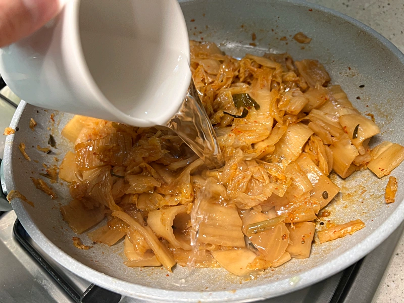 좋아하는 김치의 식감에 따라 추후 물을 더 넣어서 끓일 수도 있고 지금 넣는 물의 양으로만 볶은 뒤 완성시킬 수도 있어요