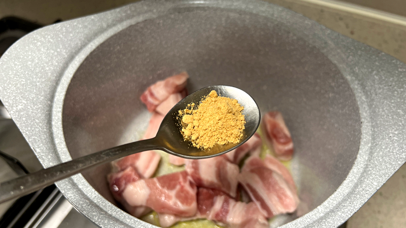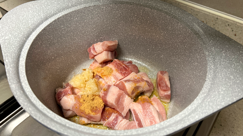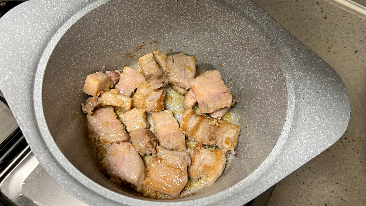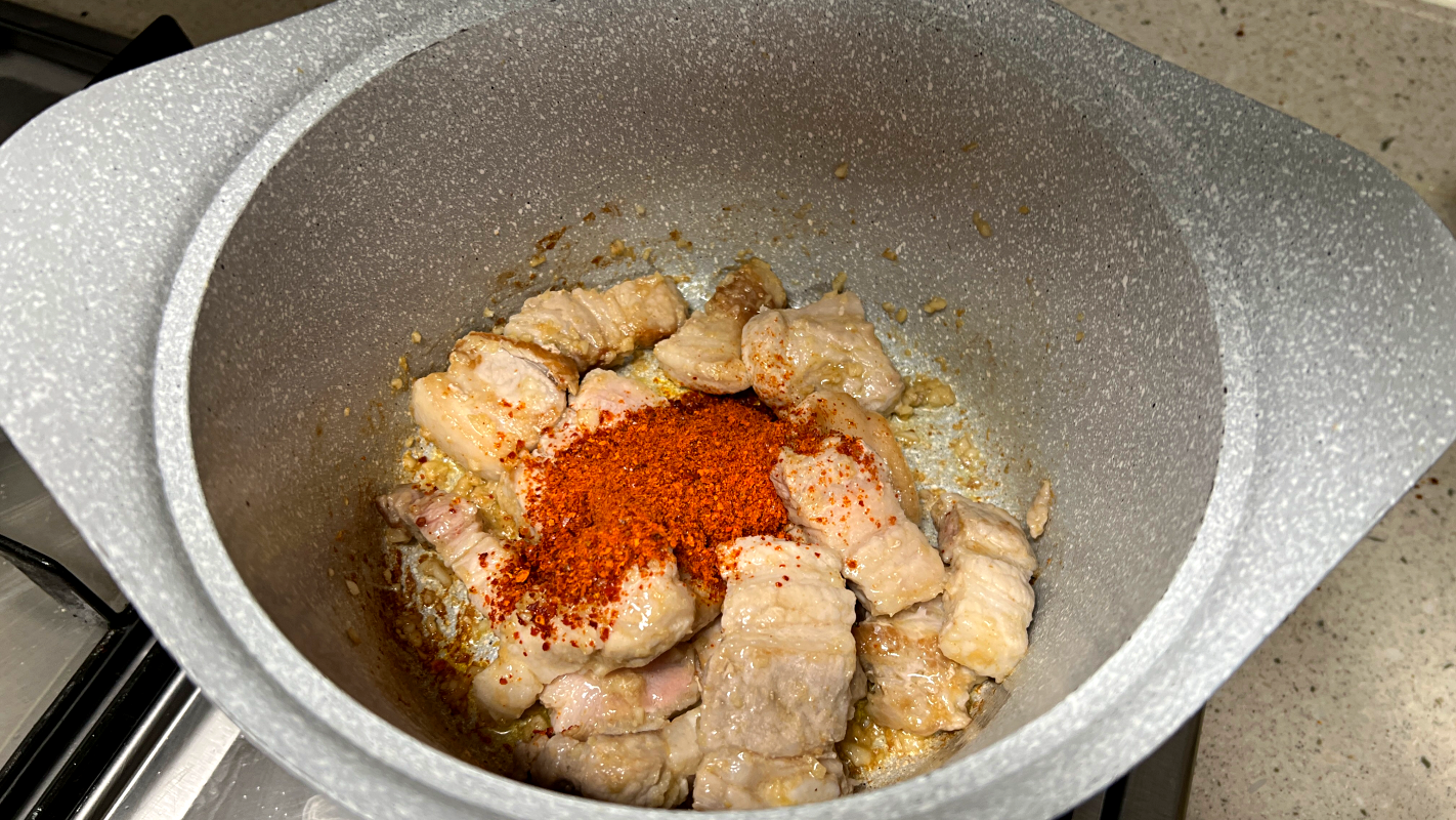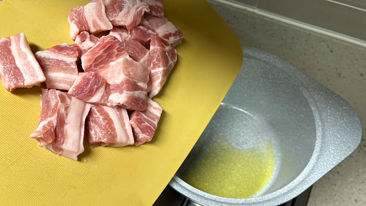 기름 두르고 냄비가 달궈지면 삼겹살 넣고 겉면이 익을 때까지만 볶아주세요