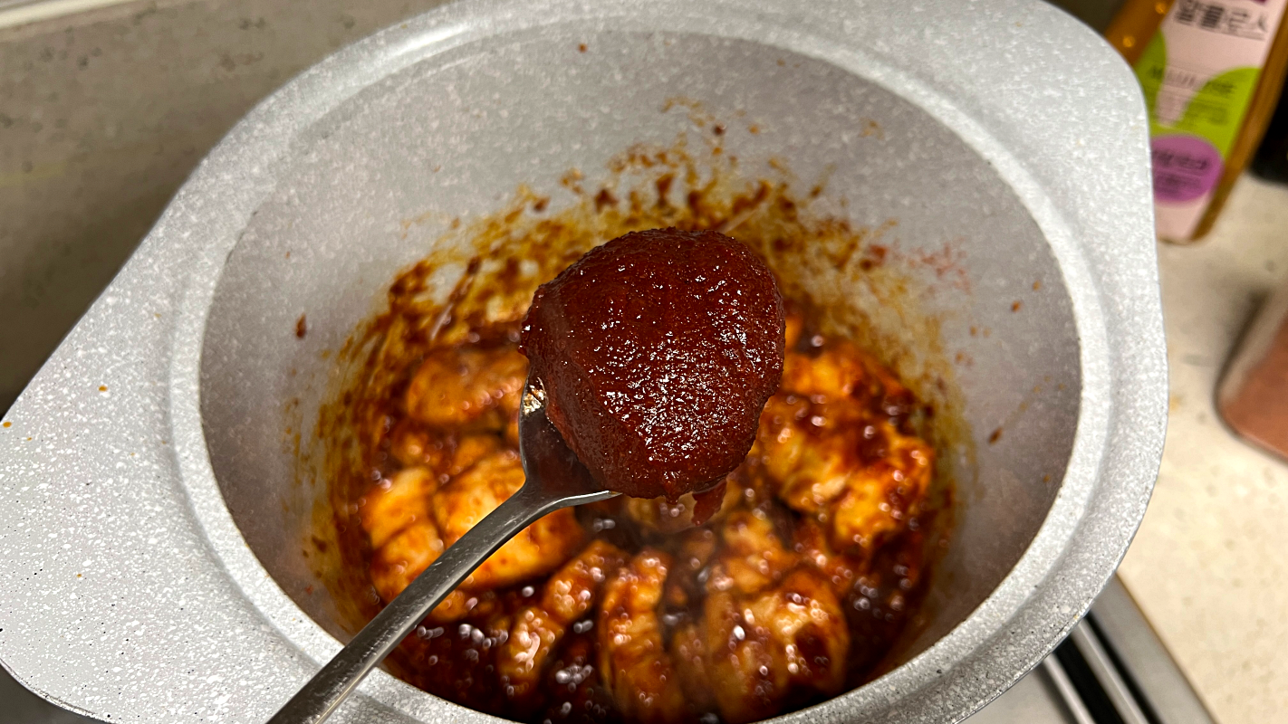 : 액젓 1스푼, 간장 2스푼, 설탕 2스푼, 고추장 4스푼, 새우젓 1스푼