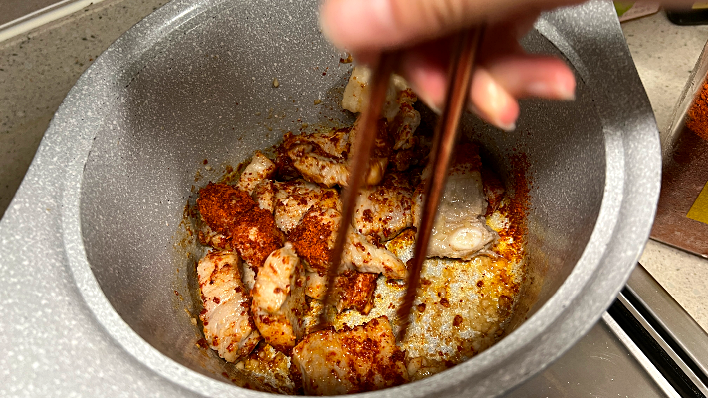 고기 넣고 바로 뒤적뒤적 하지 말고 기름이 충분히 나올 때까지 가만히 놔두는 게 좋습니다
