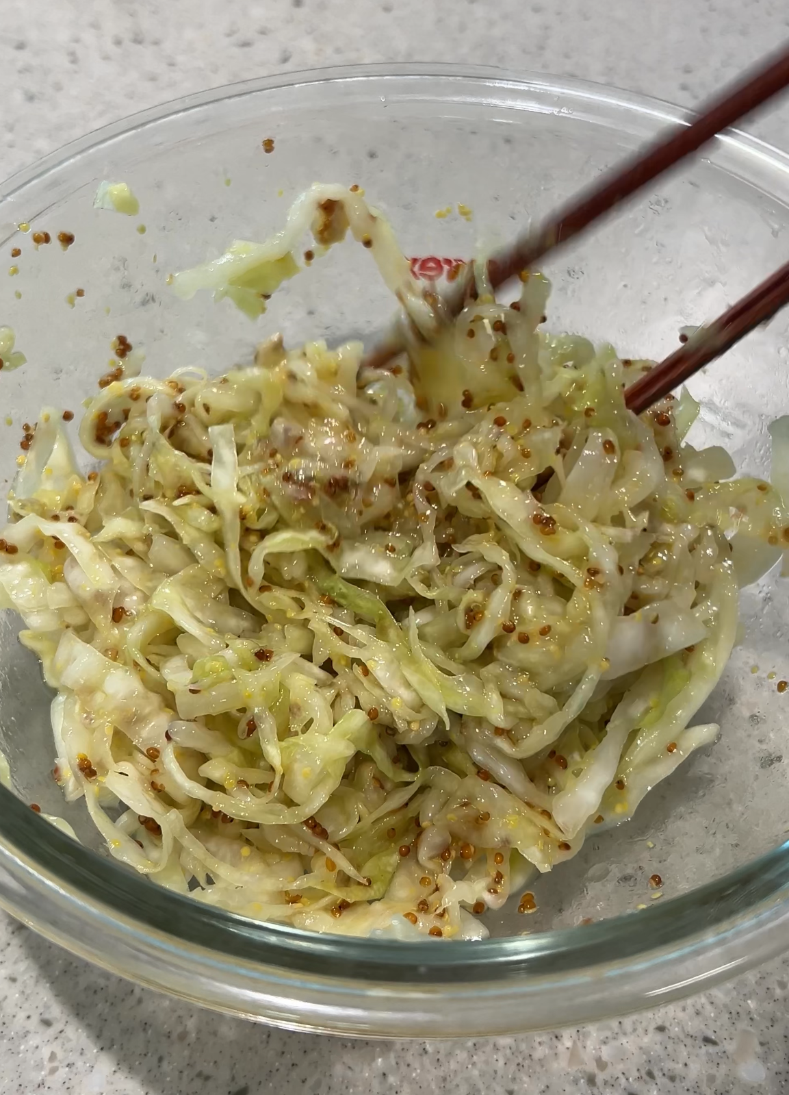 볼에 양배추를 담고 아래 소스를 넣어줍니다