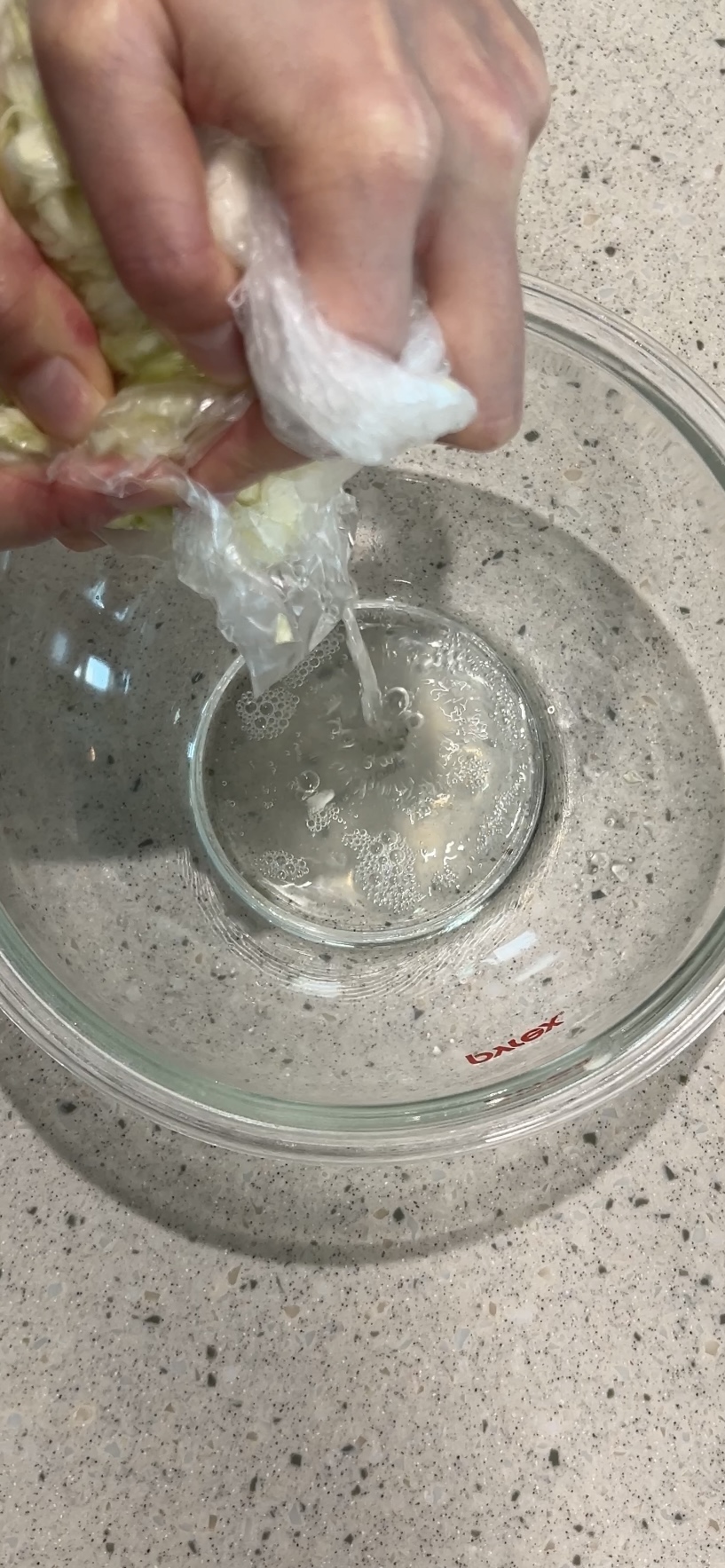 물기가 없어질 때까지 양배추를 꾹 짜주세요