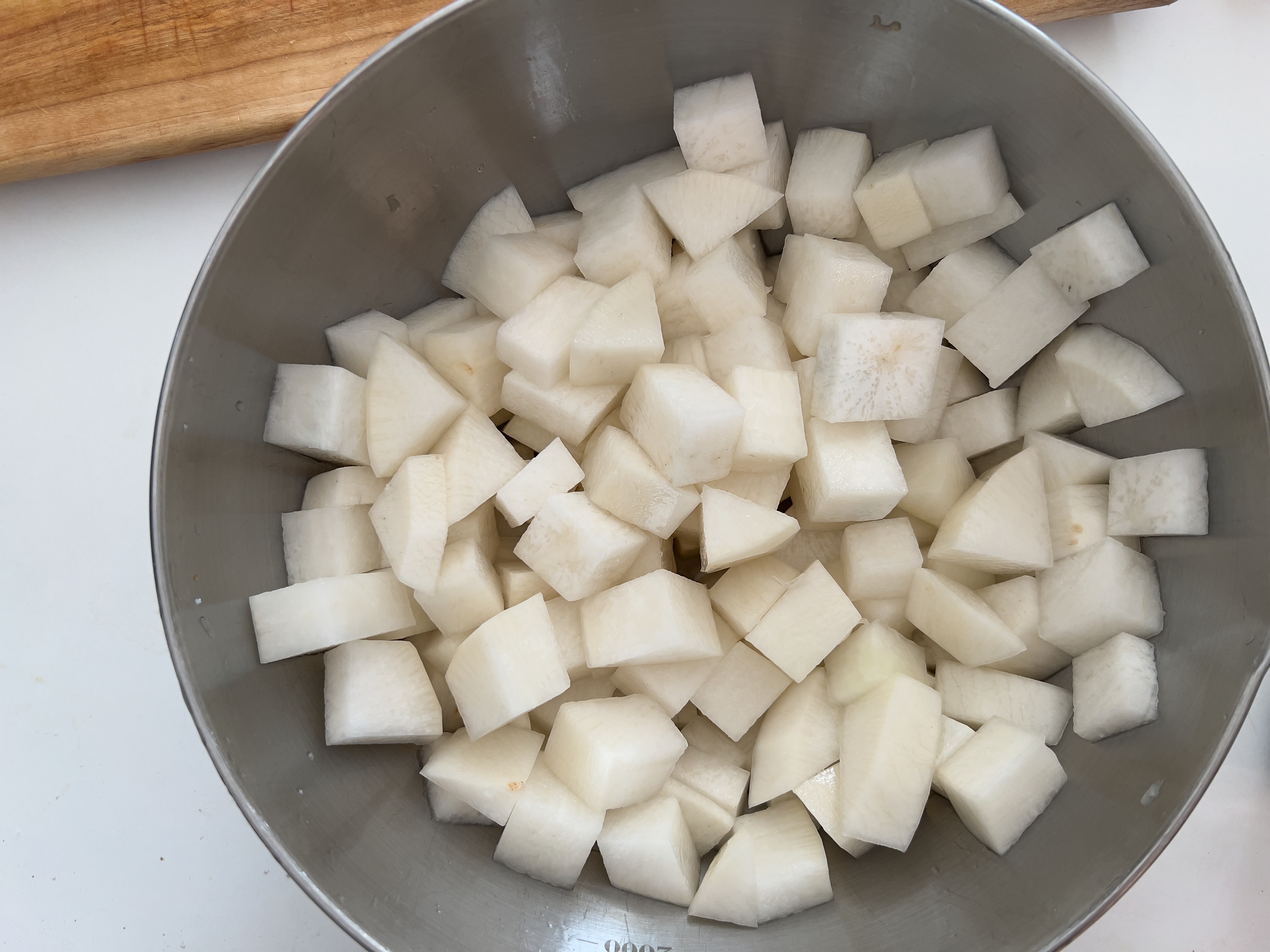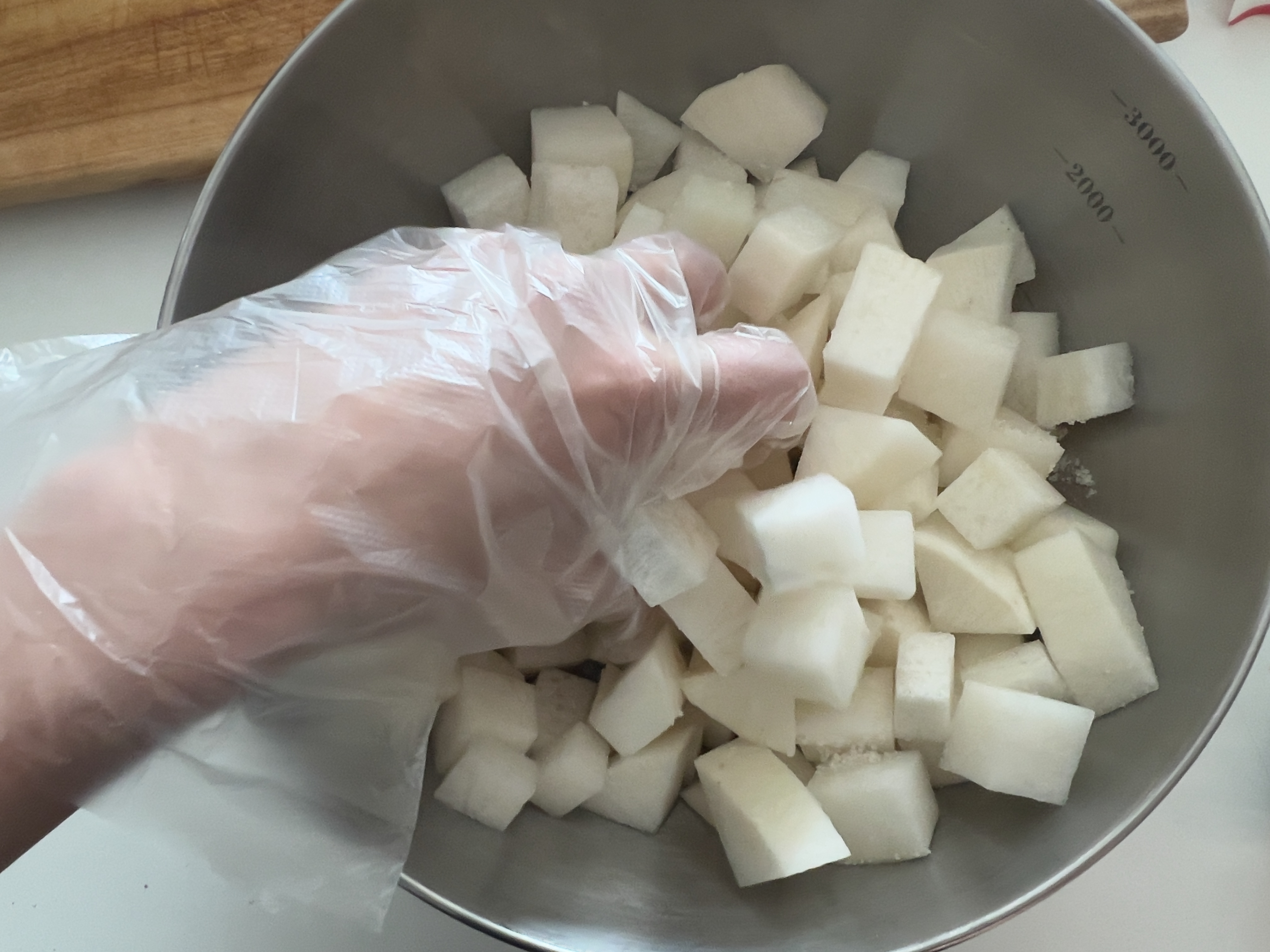 볼에 무를 담고 굵은 소금 1스푼과 물 80ml를 붓고