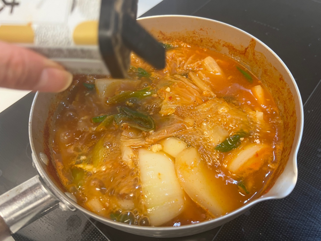 다 끓어갈 때쯤 고춧가루와 다진마늘을 추가해요